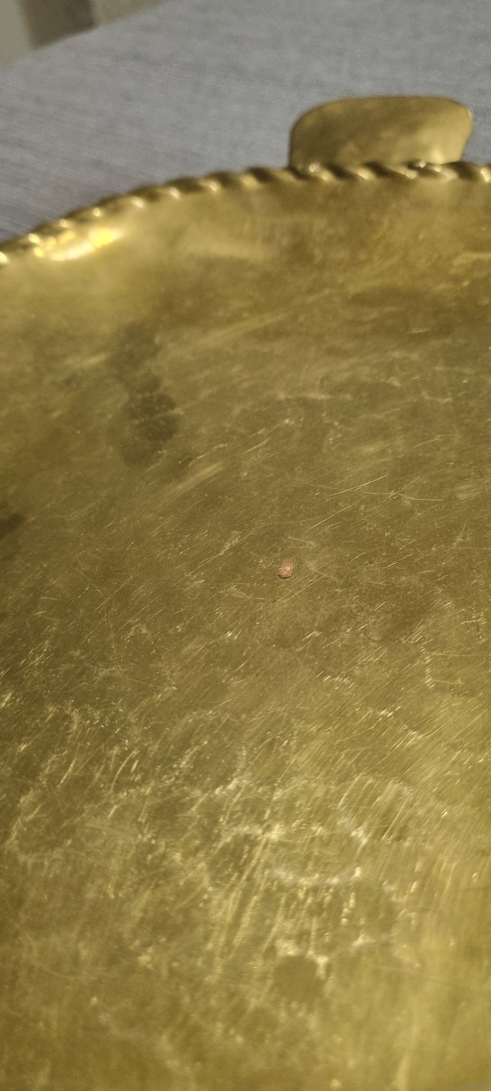 Старинный латунный поднос с низкими декоративными бортами и двумя ручками.