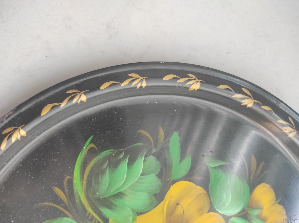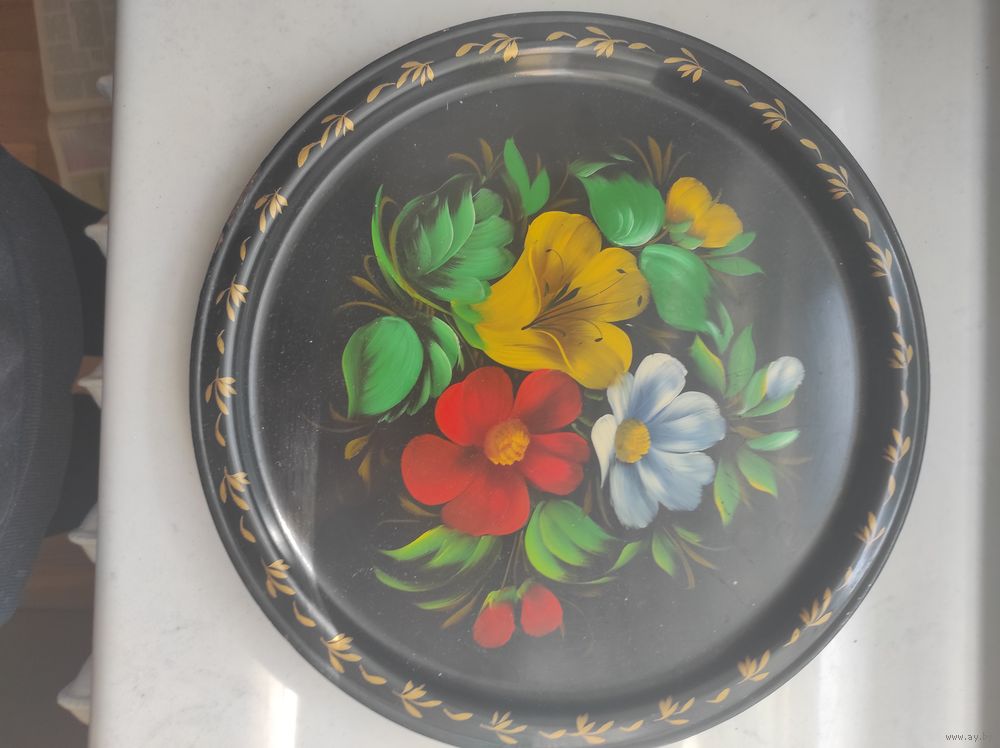 Жостовский металлический поднос, ручная роспись. Диаметр -32 см. Незначительные следы использования. СССР.