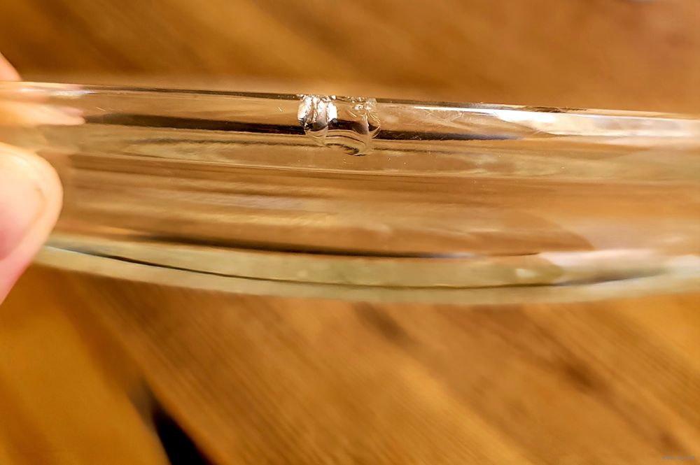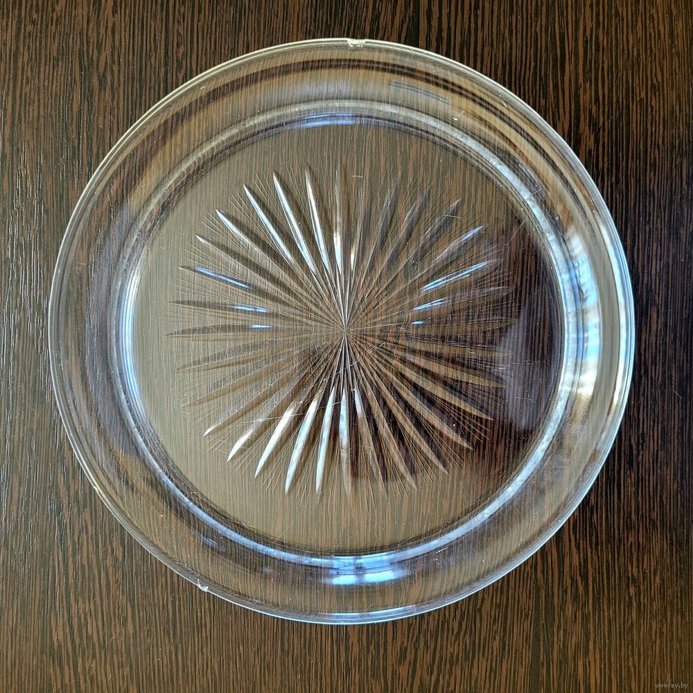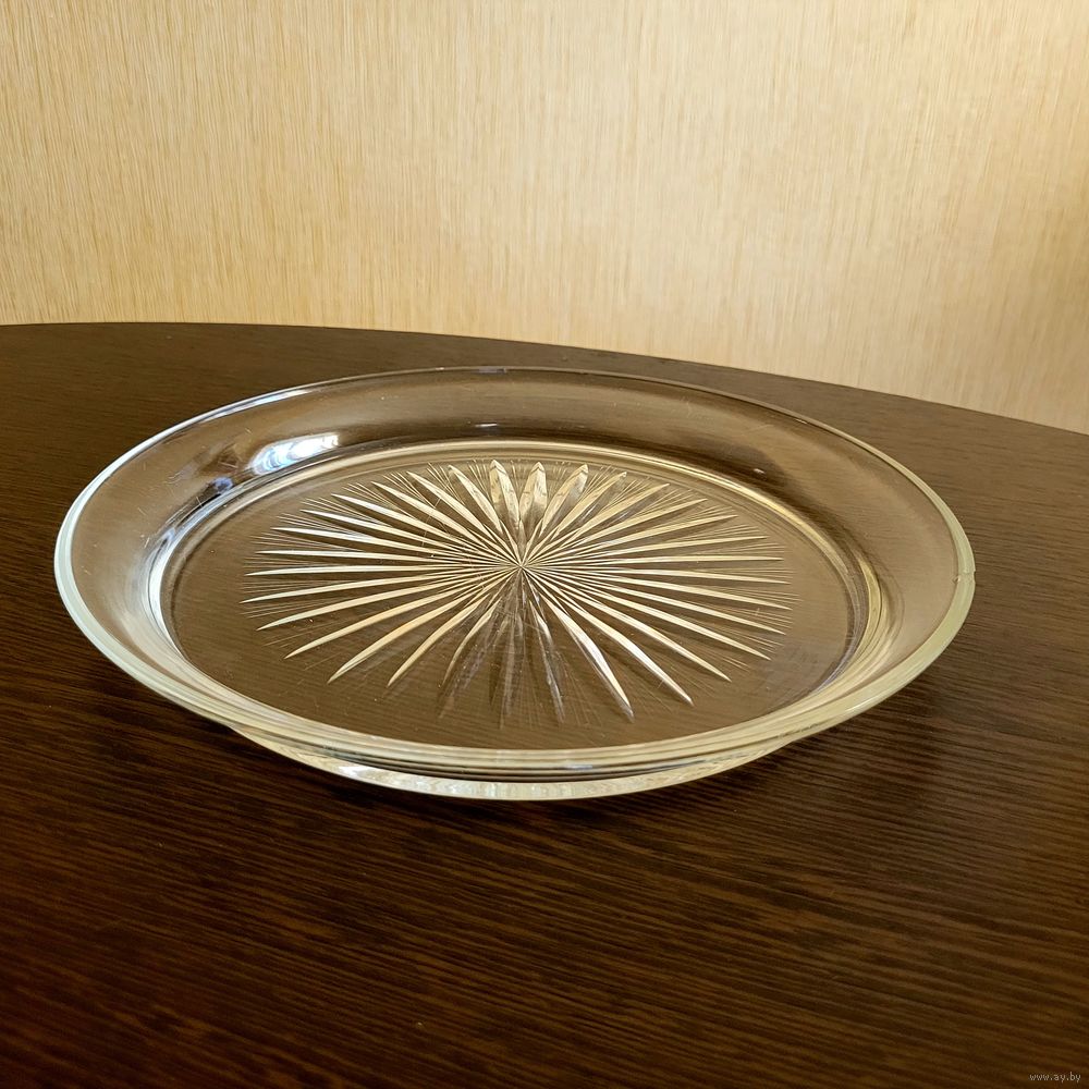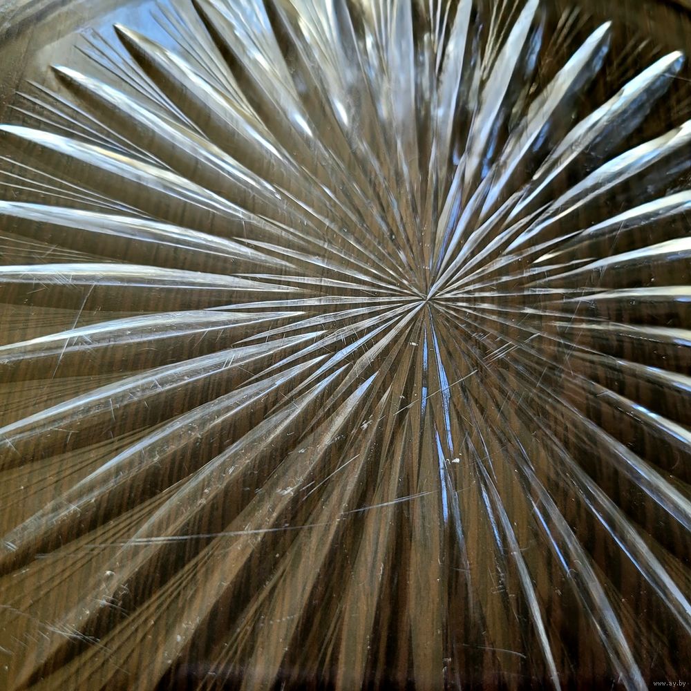Стеклянный поднос с гранёным дном, 25 см, высота 2,5 см. Период СССР, вероятно 1950-60 гг. Такие подносы обычно использовались под графин с водой.