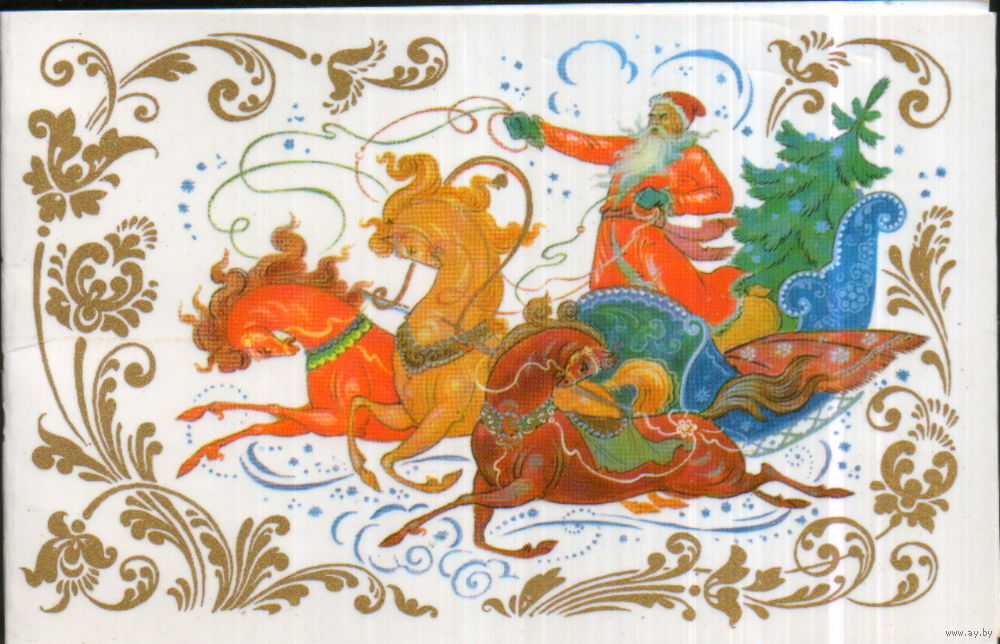 Подписанная двойная открытка 1977г. "С Новым годом! Дед Мороз на тройке" худ. К. Бокарев