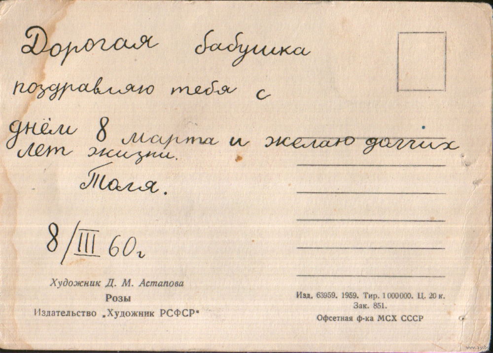 Подписанная открытка 1959г. "Розы" худ. Д. Астапова