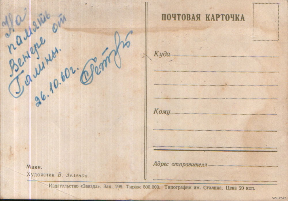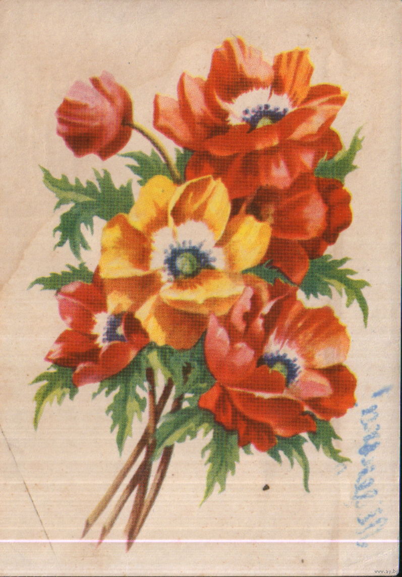 Подписанная открытка 1960-ые гг. БССР "Маки" худ. В. Зеленов (черн.)