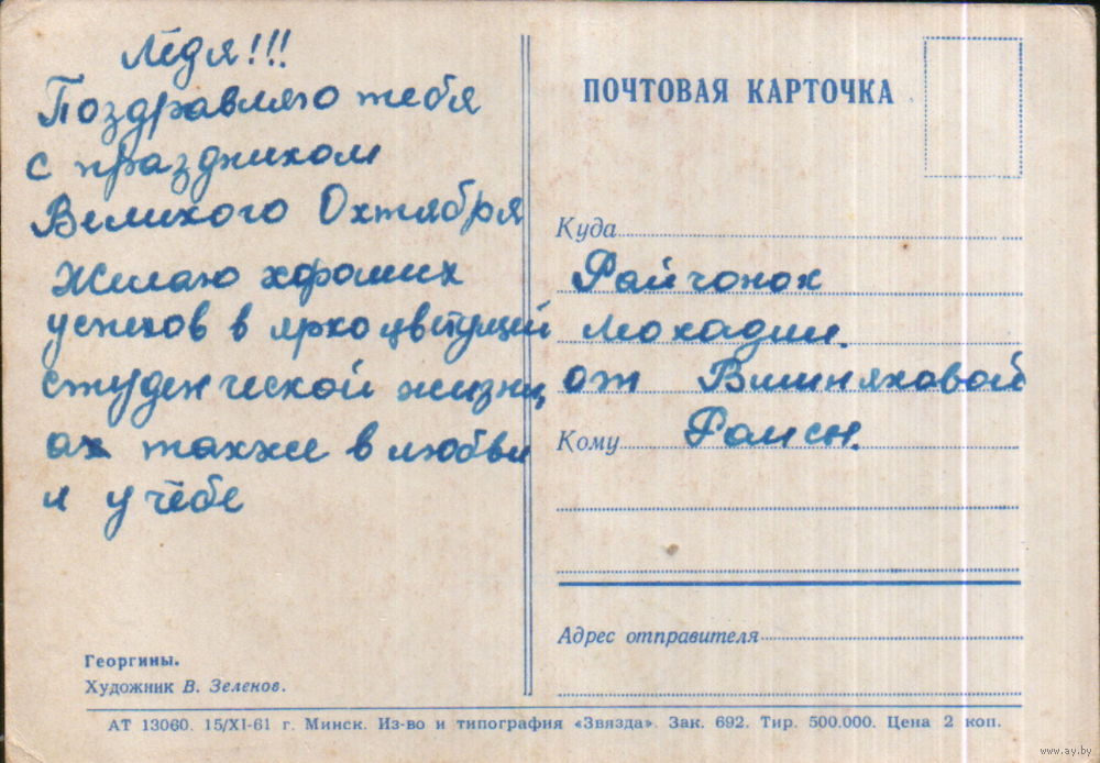 Подписанная открытка 1961 г. БССР "Георгины" худ. В. Зеленов