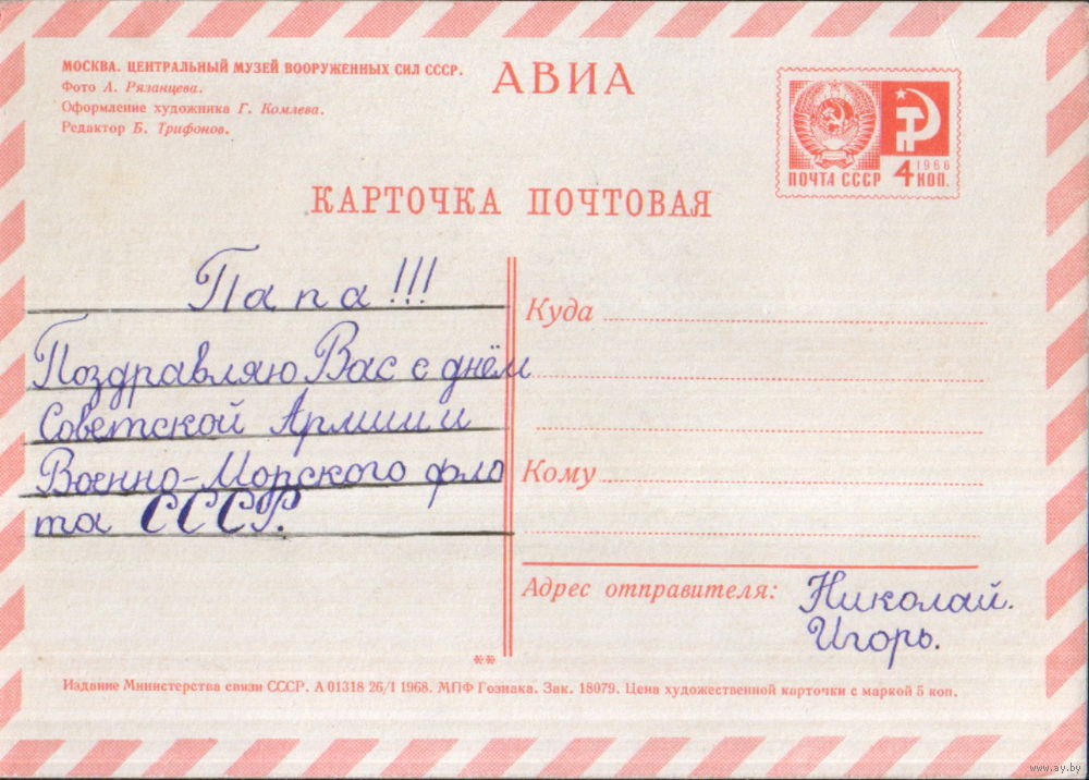 Подписанная открытка 1968г. "23 Февраля. Слава Вооруженным Силам Советского Союза!" фото А. Рязанцев, худ. Г. Комлев