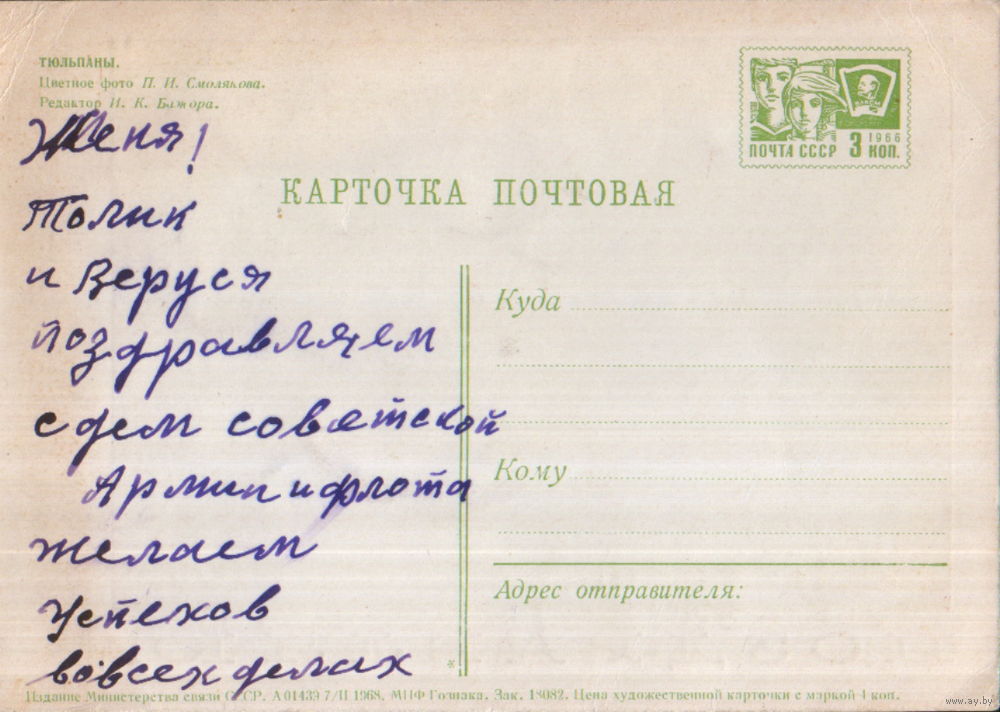 Подписанная открытка 1968г. "Тюльпаны" фото П. Смоляков