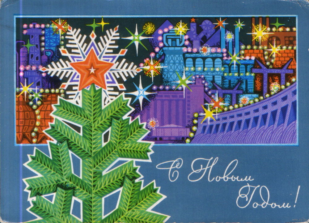 Подписанная открытка 1971г. "С Новым годом! Елка на фоне индустриального пейзажа" худ. Ю. Косоруков