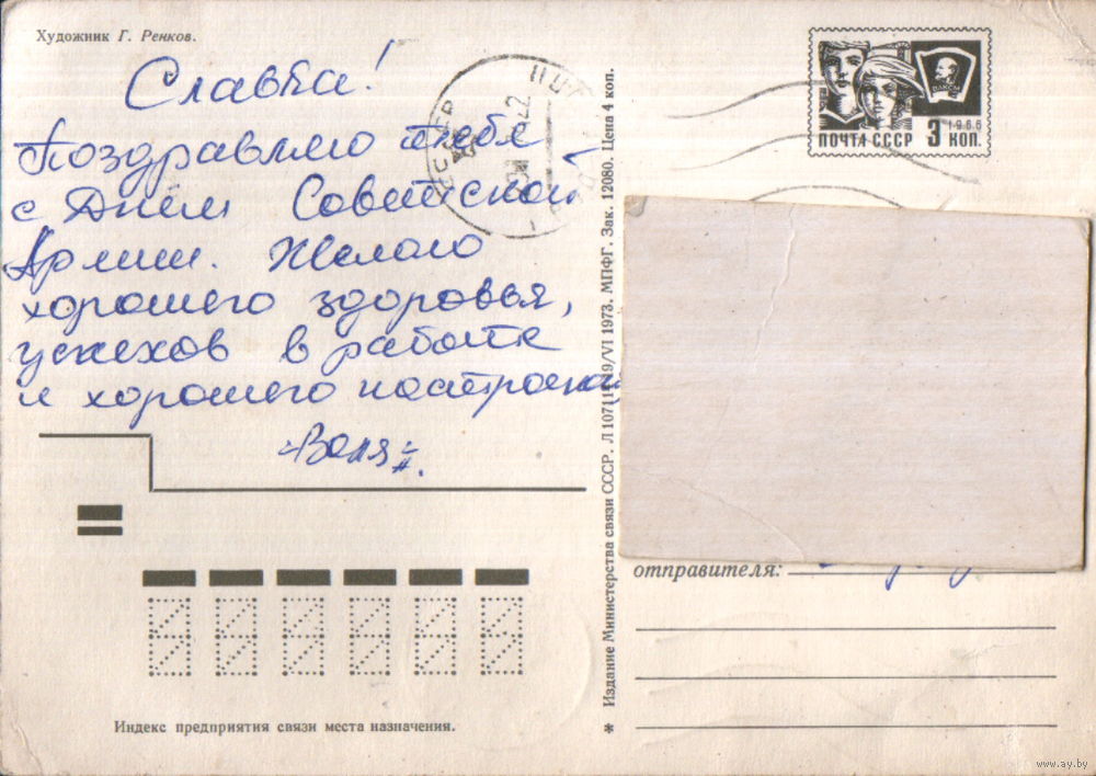 Подписанная открытка 1973г. "23 Февраля. Слава Советской Армии!" худ. Г. Ренков
