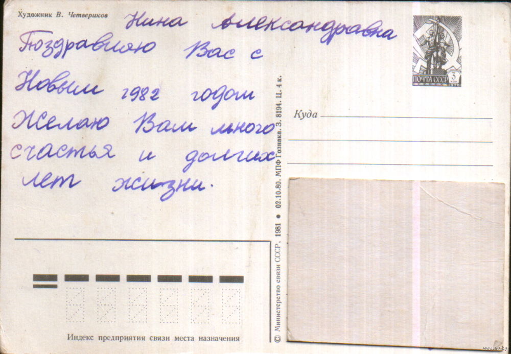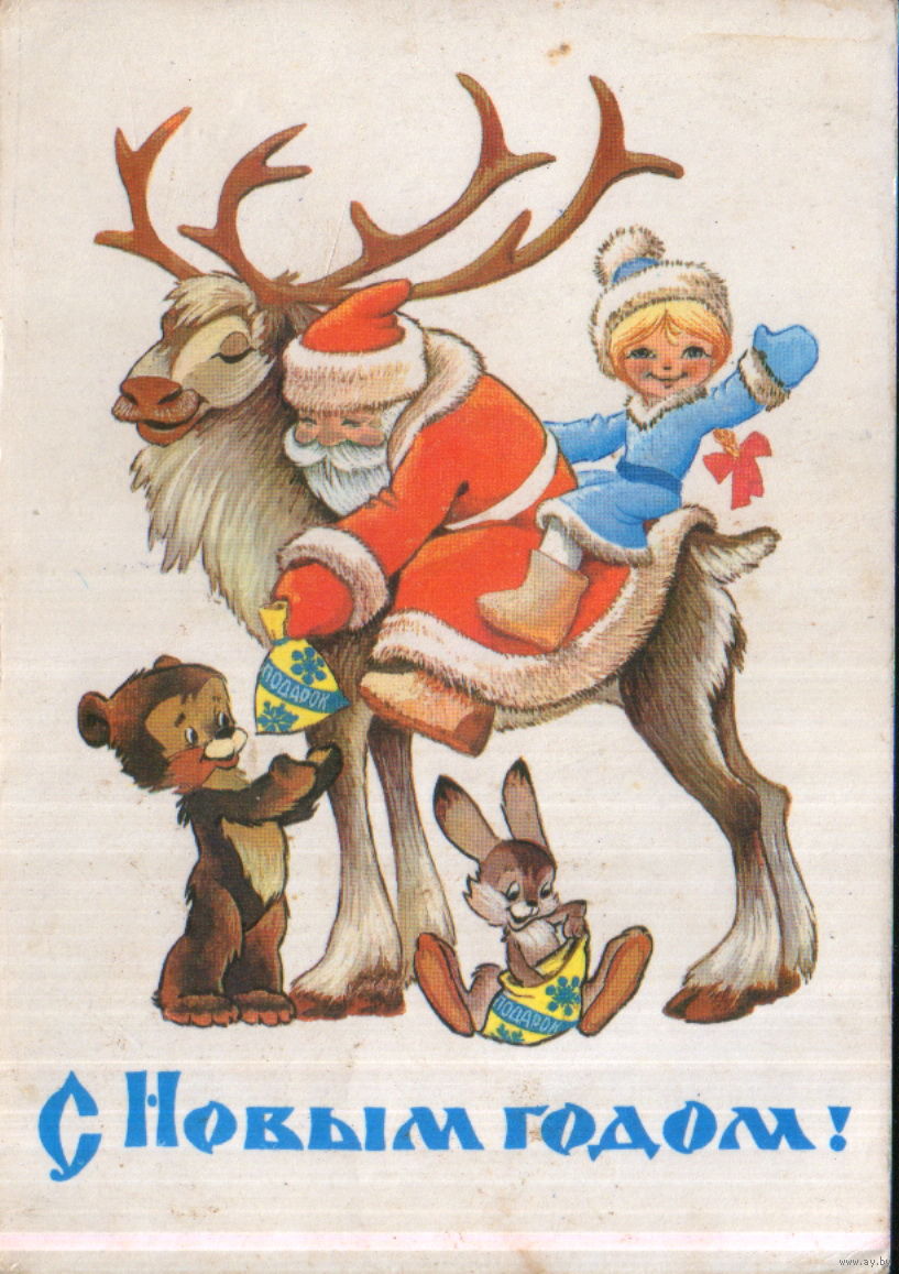 Подписанная открытка 1980г. "С Новым годом! Дед Мороз и Снегурочка на олене" худ. В. Четвериков