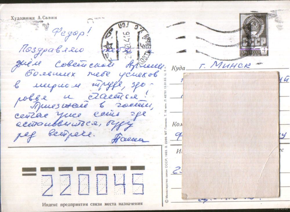 Подписанная открытка 1983г. "23 Февраля. Слава Вооруженным Силам СССР!" худ. А. Савин
