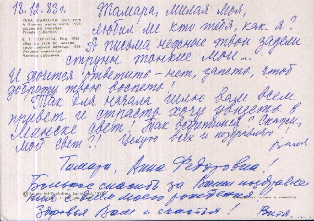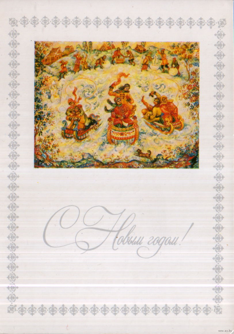 Подписанная открытка 1983г. "С Новым годом! В. Старкова "Как по этой по метели трое саночек летели" Мстёра