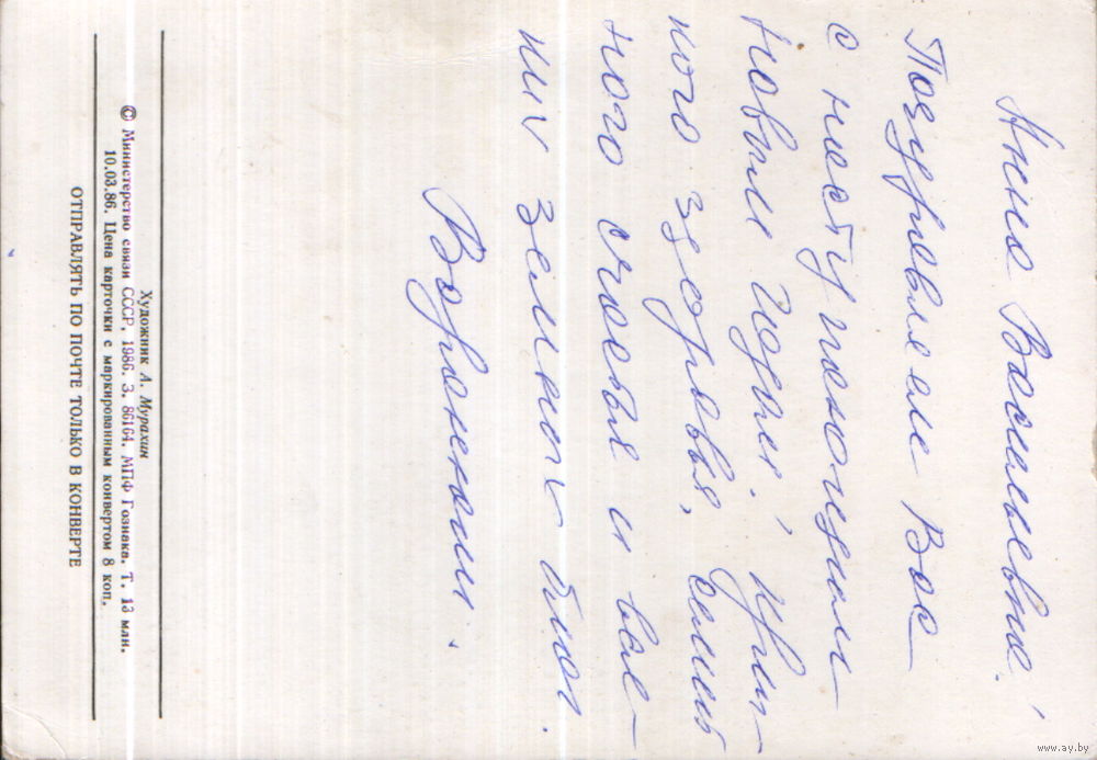 Подписанная открытка 1986г. "С Новым годом! Часы" худ. А. Мурахин