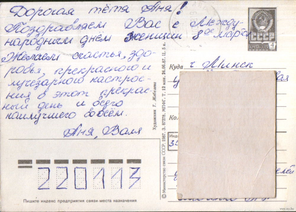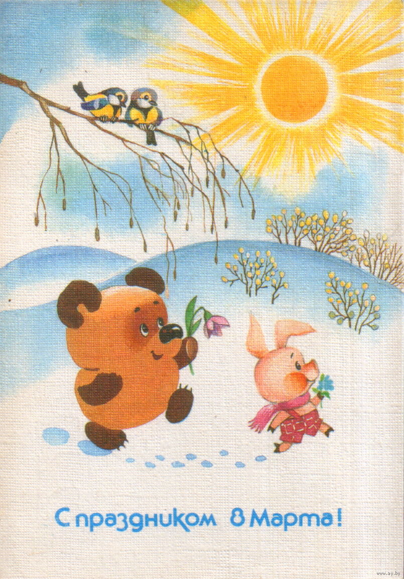 Подписанная открытка 1987г. "8 Марта. Винни-Пух и Пятачок" худ. Т. Жебелева