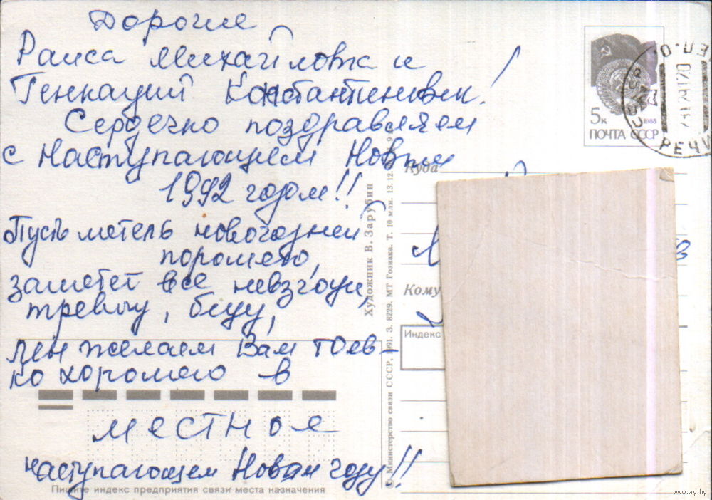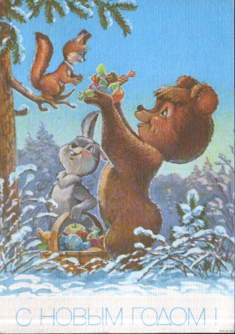 Подписанная открытка 1990г. "С Новым годом! Медведь и Заяц поздравляют Белку" худ. В. Зарубин