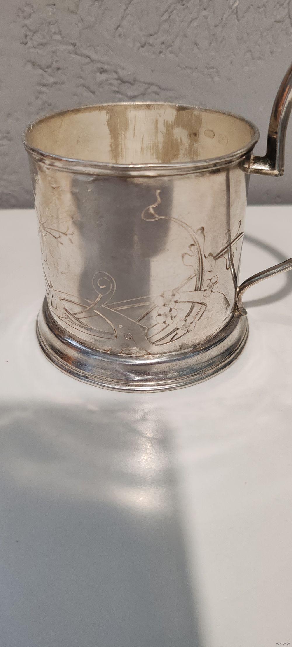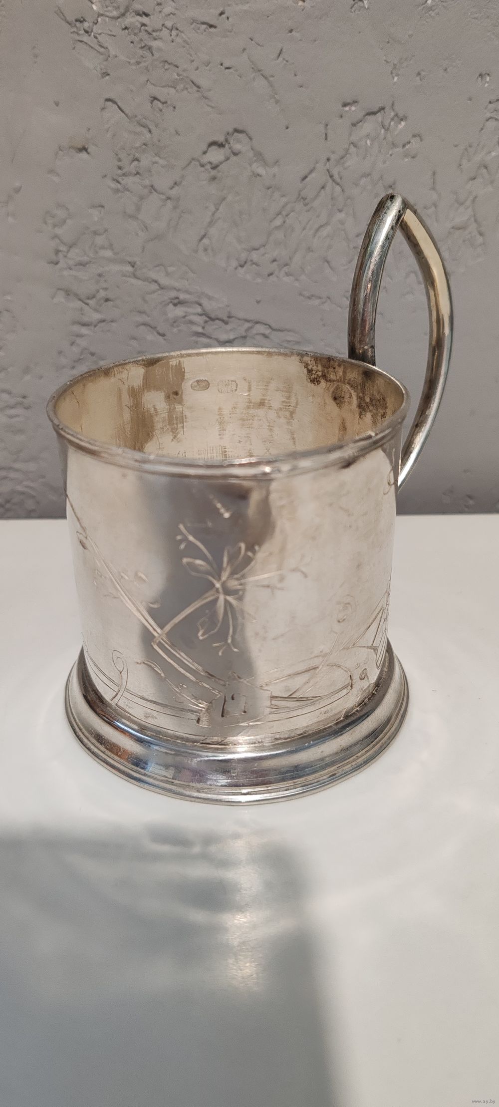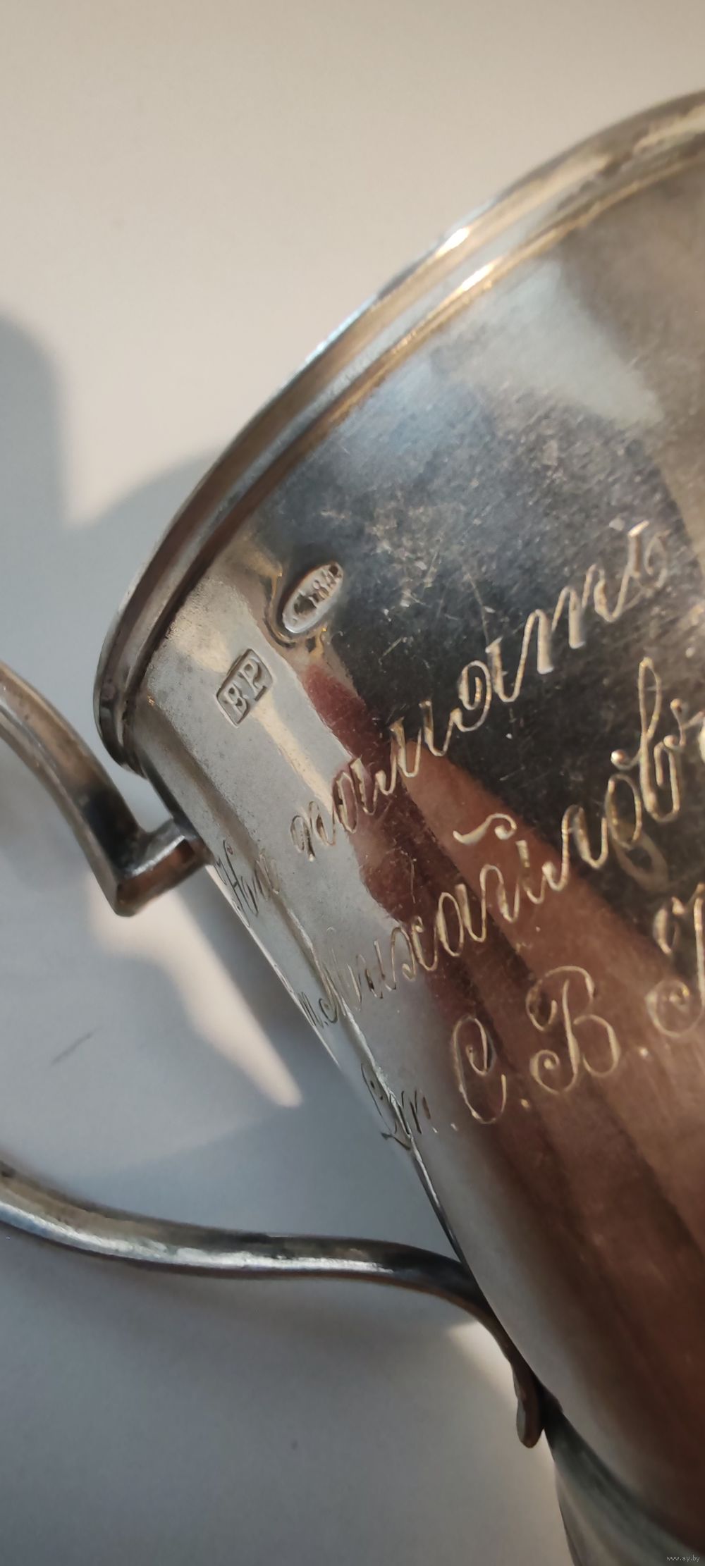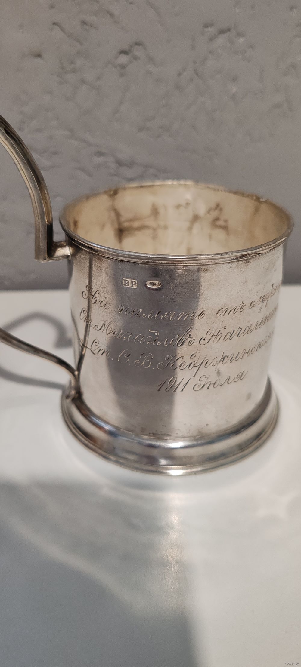| Отличный подстаканник с очень интересной дарственной надписью. На память отъ служащихъ Ст.Михайловъ Начальнику Ст. С. В. Кедржинскому 1911 Июля | |