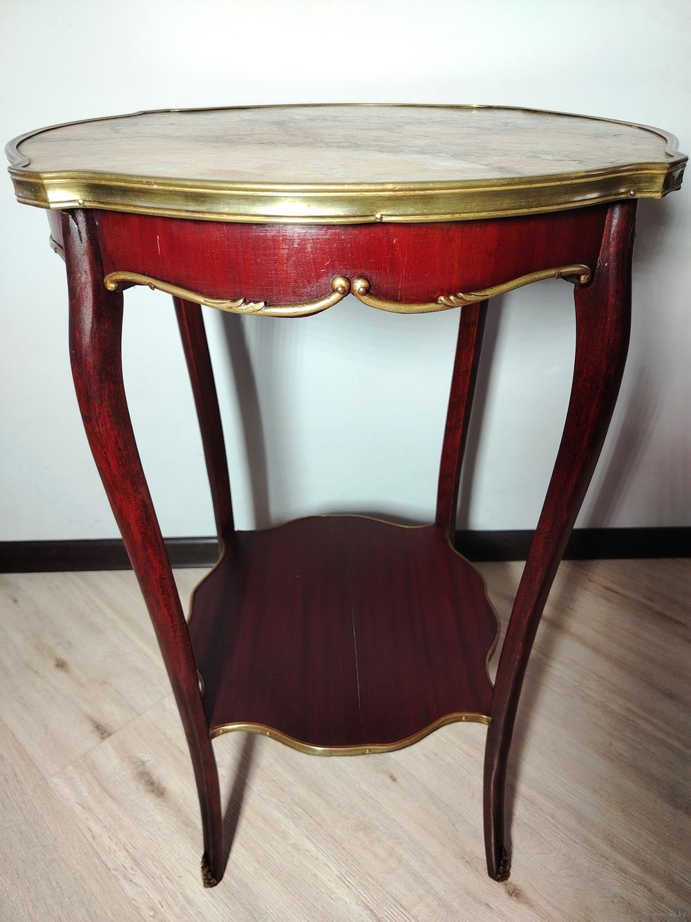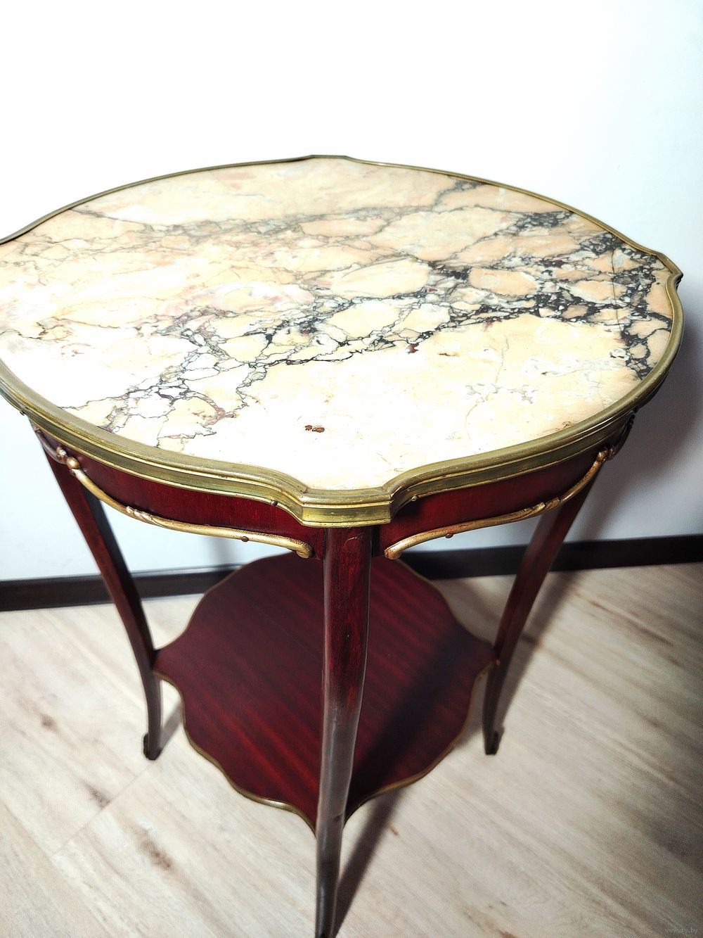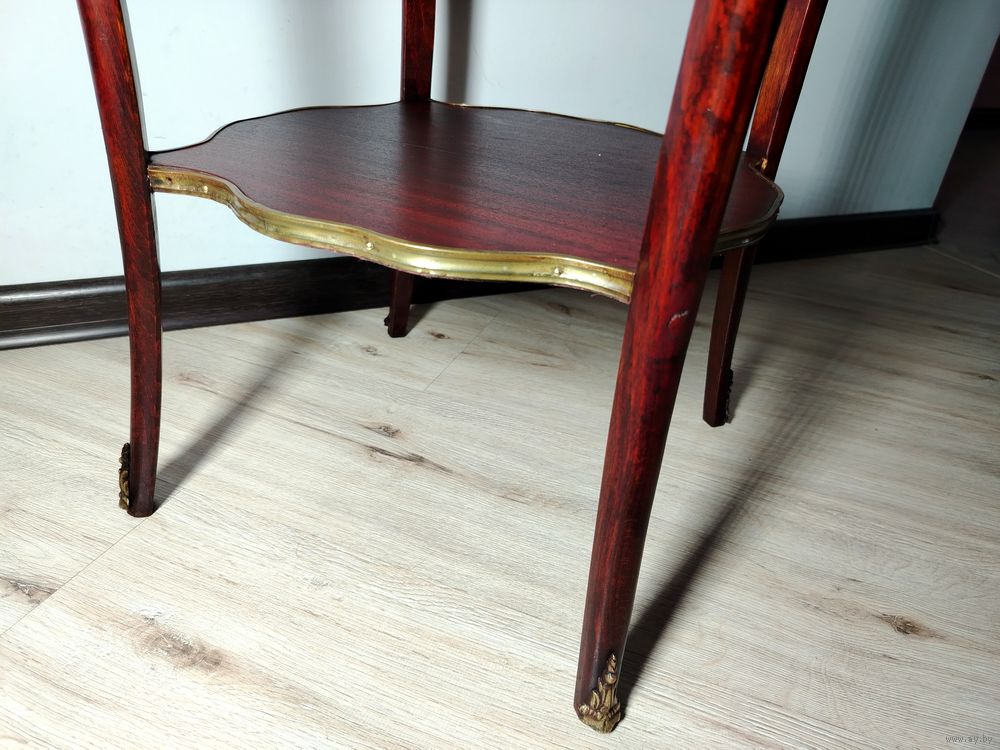 Столик (подставка). Европа. Массив дерева, бронзовые элементы, мраморная столешница. Высота 70 см диаметр столешницы 48см.
