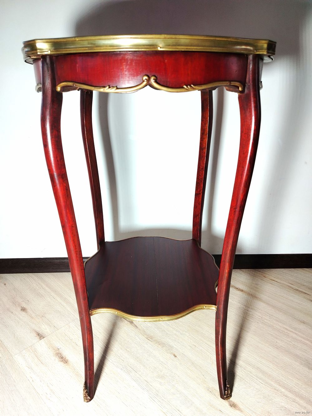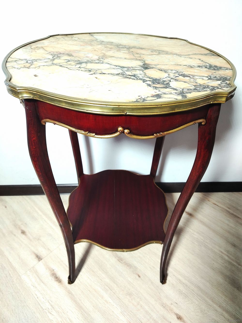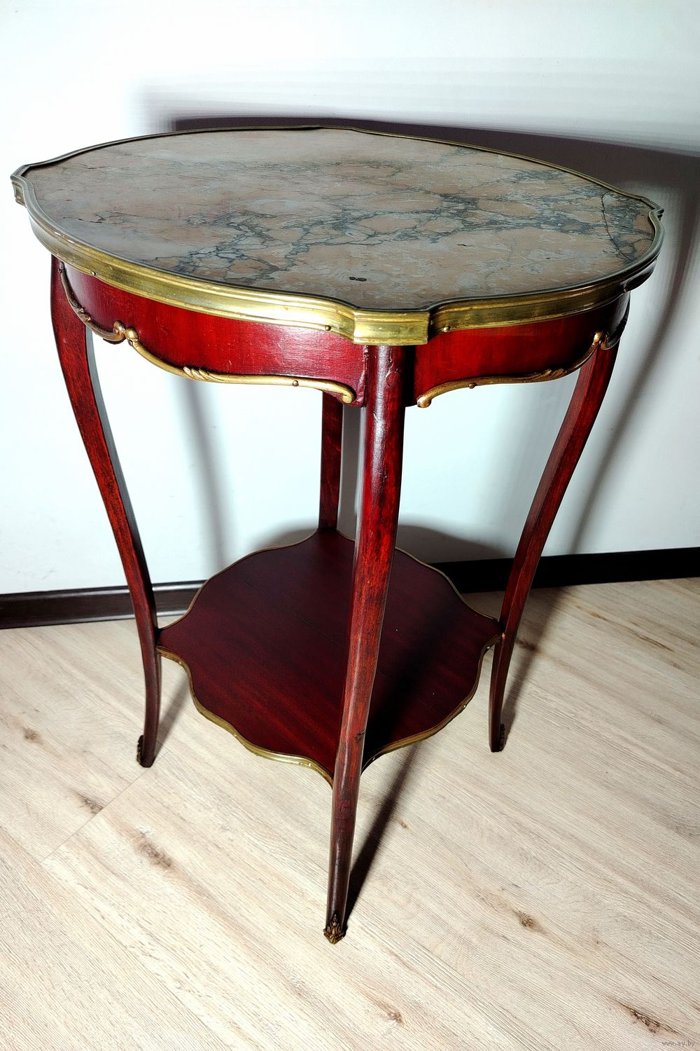 Столик (подставка). Европа. Массив дерева, бронзовые элементы, мраморная столешница. Высота 70 см диаметр столешницы 48см.