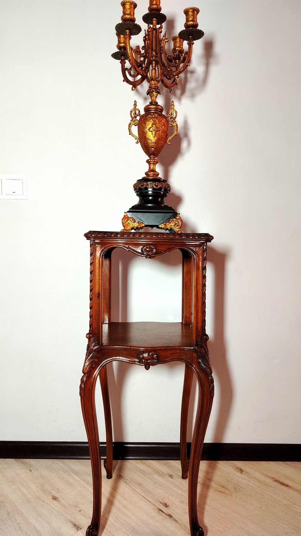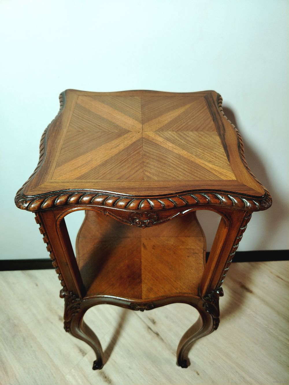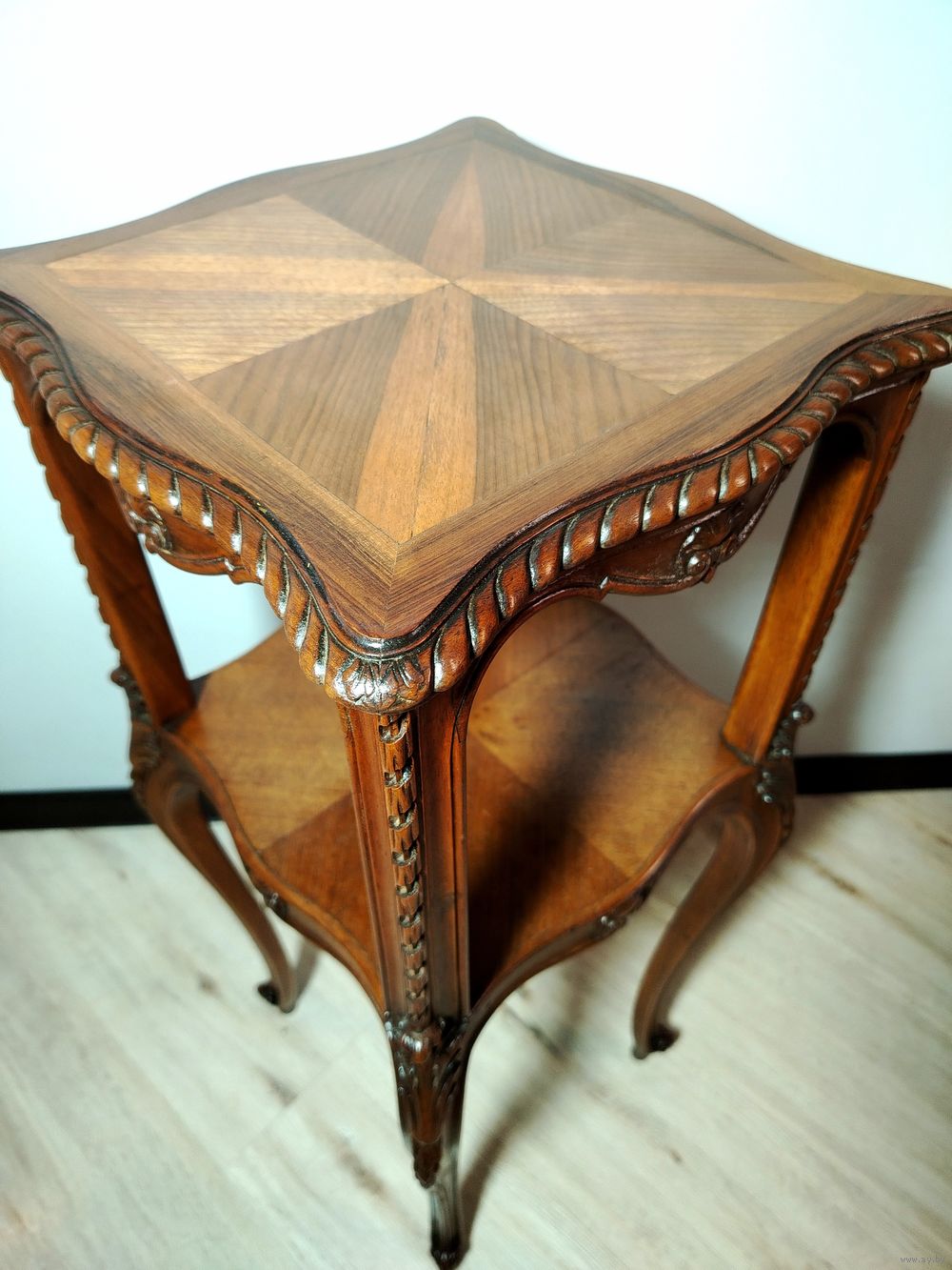 Столик (подставка). Европа. Массив дерева (орех) с красивой резьбой, техника маркетри. Высота 80 см столешница 32см на 32см.