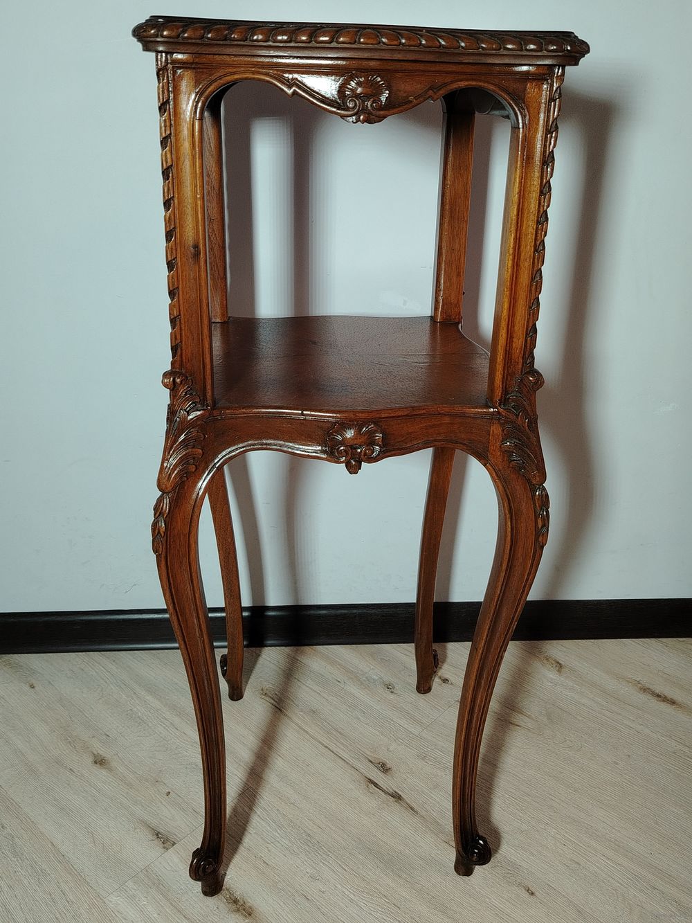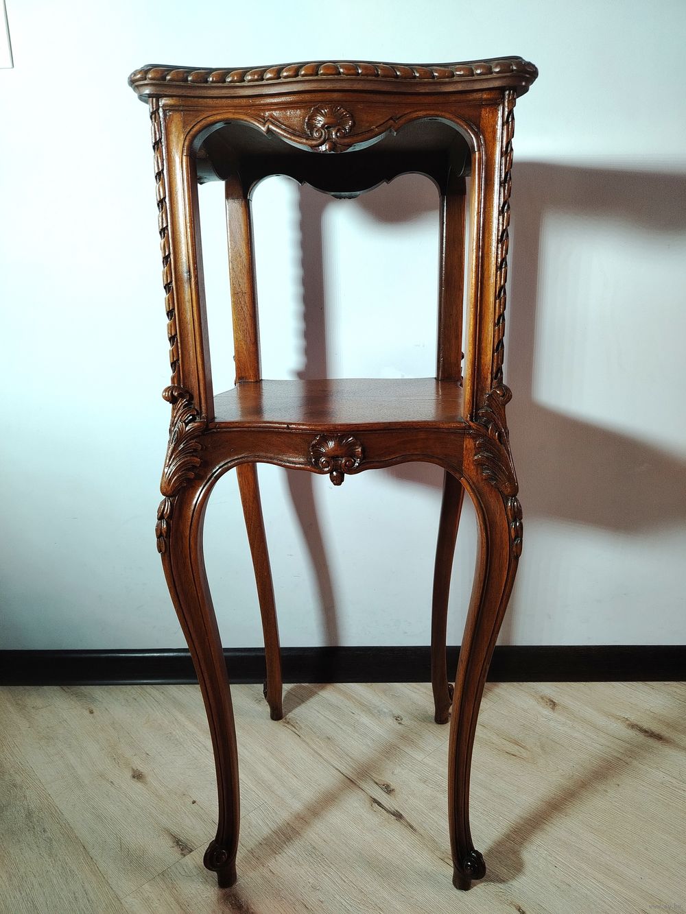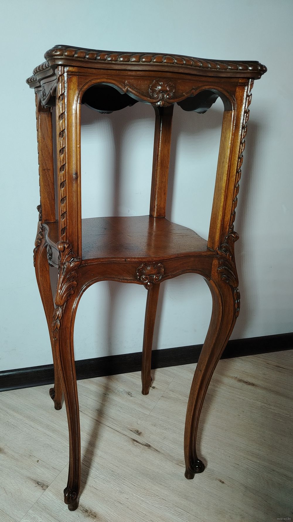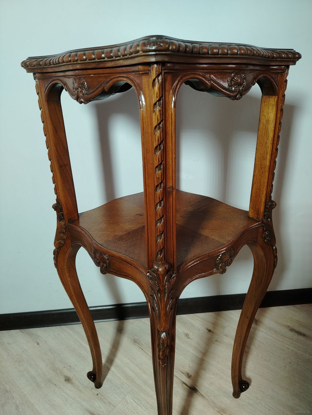 Столик (подставка). Европа. Массив дерева (орех) с красивой резьбой, техника маркетри. Высота 80 см столешница 32см на 32см.