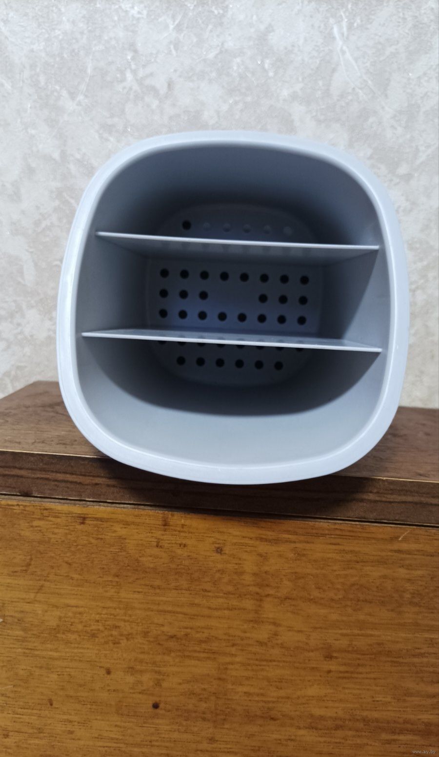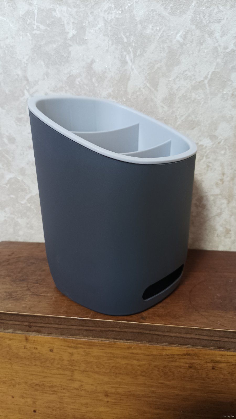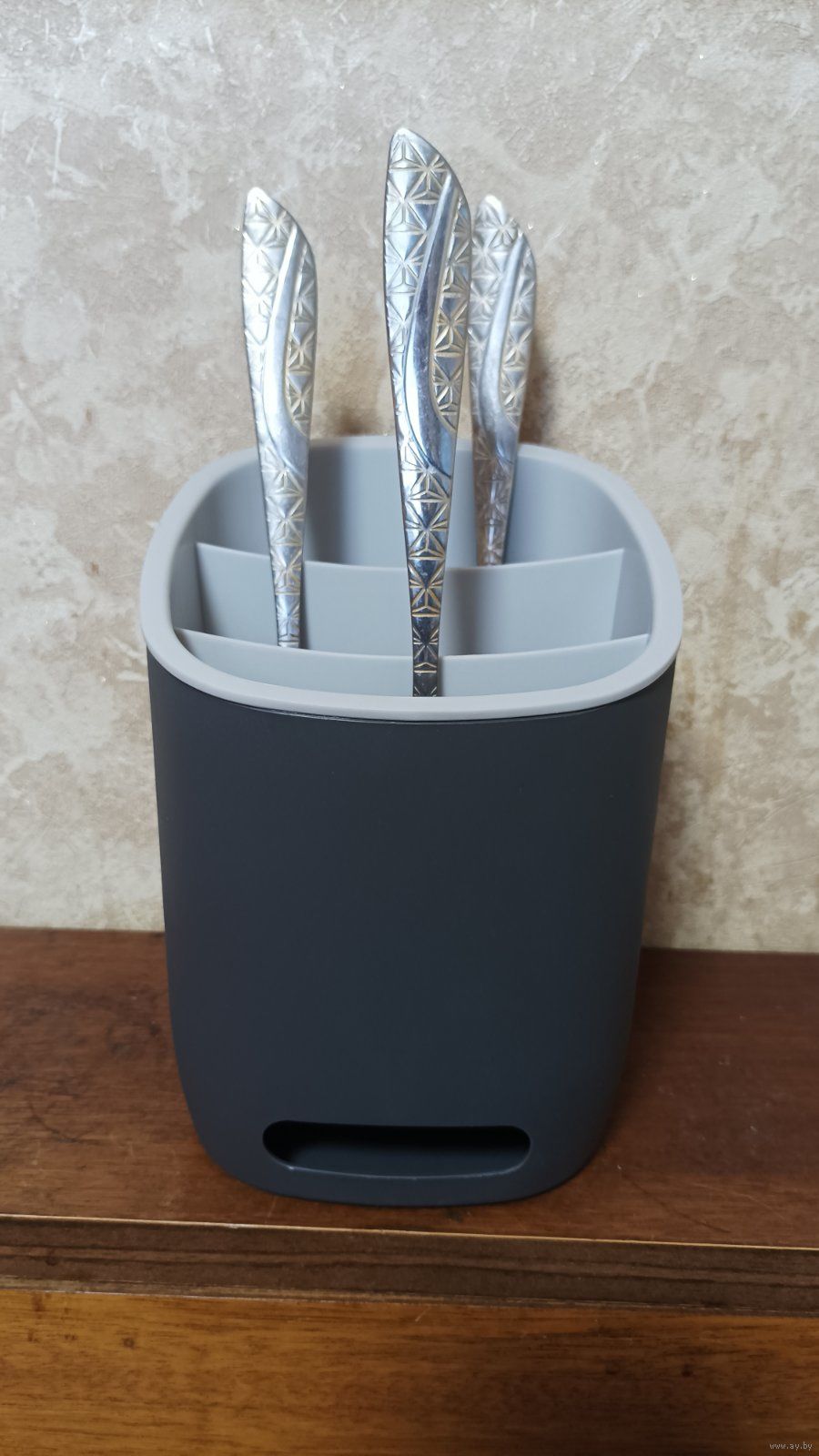 Подставка для столовых приборов IDEA. Выполнена в графитовом цвете. Высота 17см. Ширина 11см. Подставка оснащена тремя секциями, что позволяет хранение столовых приборов по типу и назначению. Сетчатое дно предотвращает скопление влаги. Состояние новой.