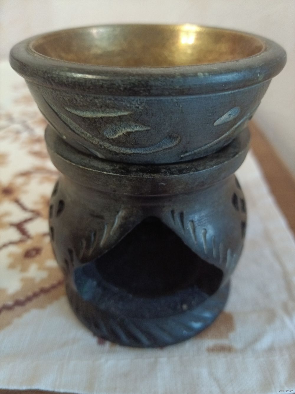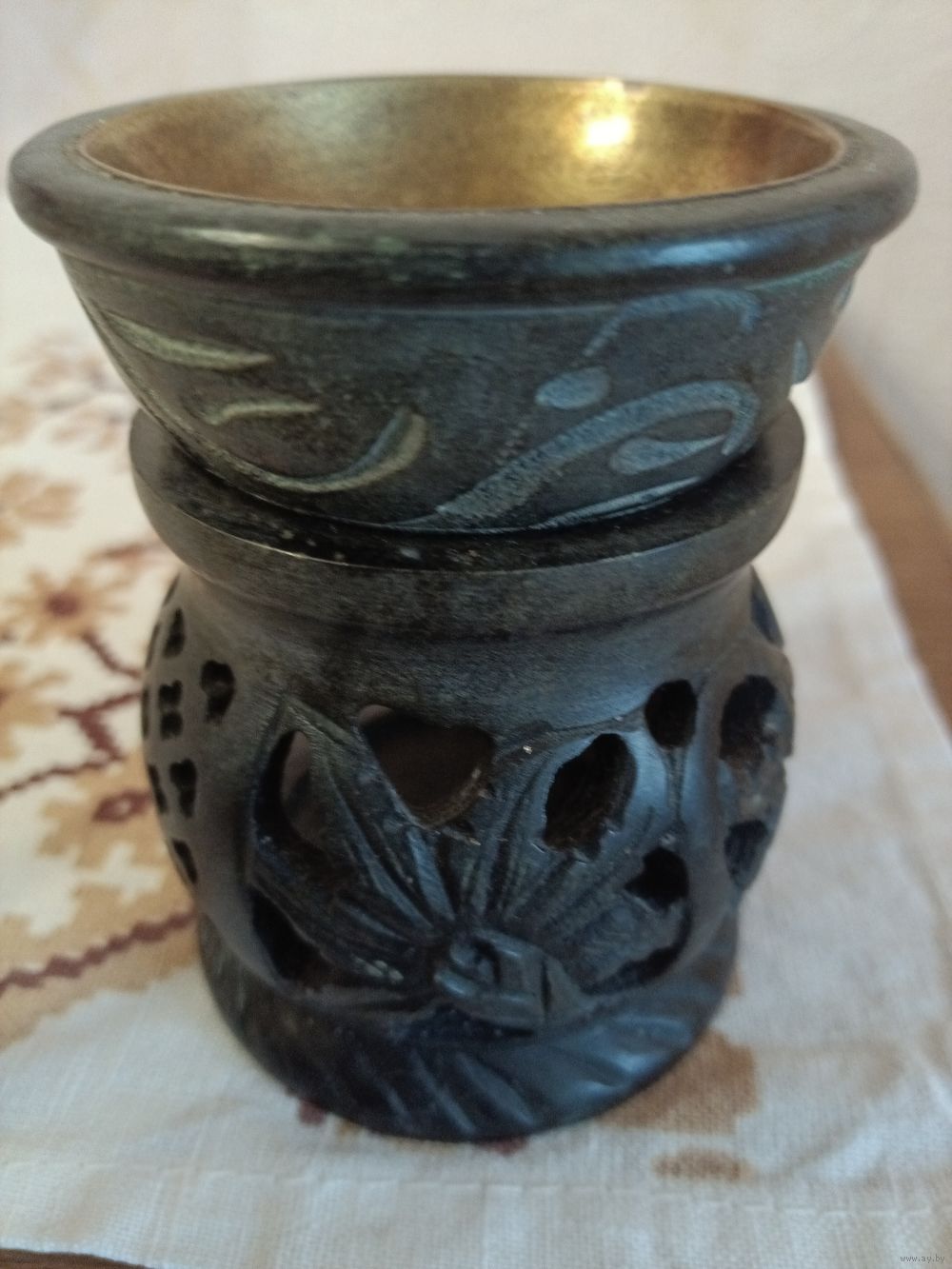 Высота 8,5 см. Камень - черный стеатит, его ещё называют мыльный или восковой камень. Съемная верхняя чаша со ставкой из бронзы