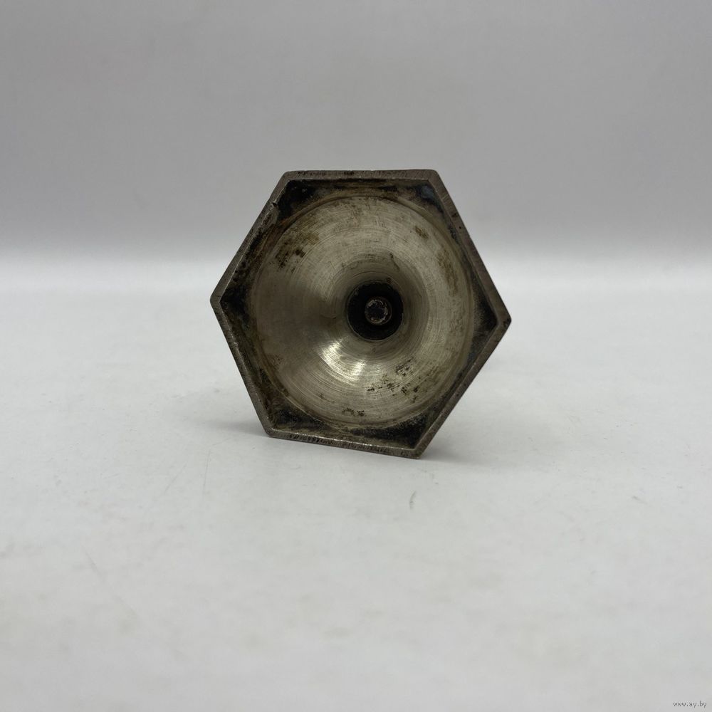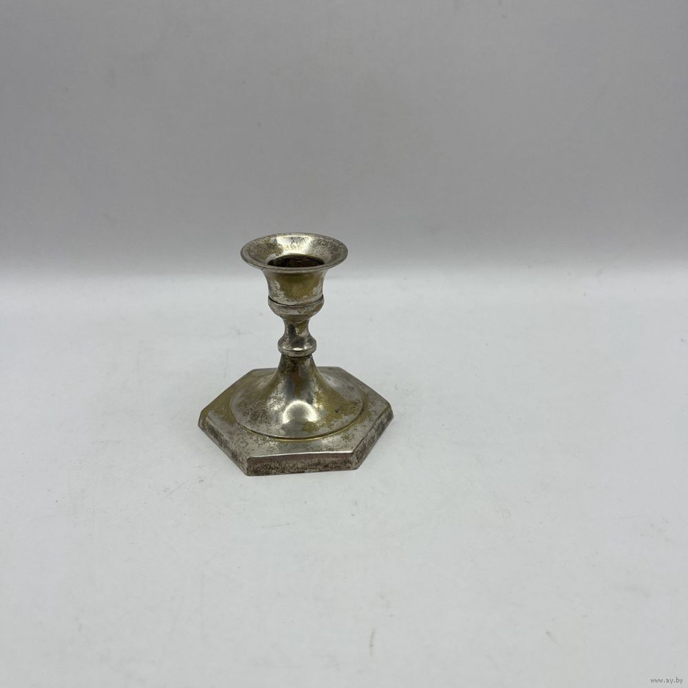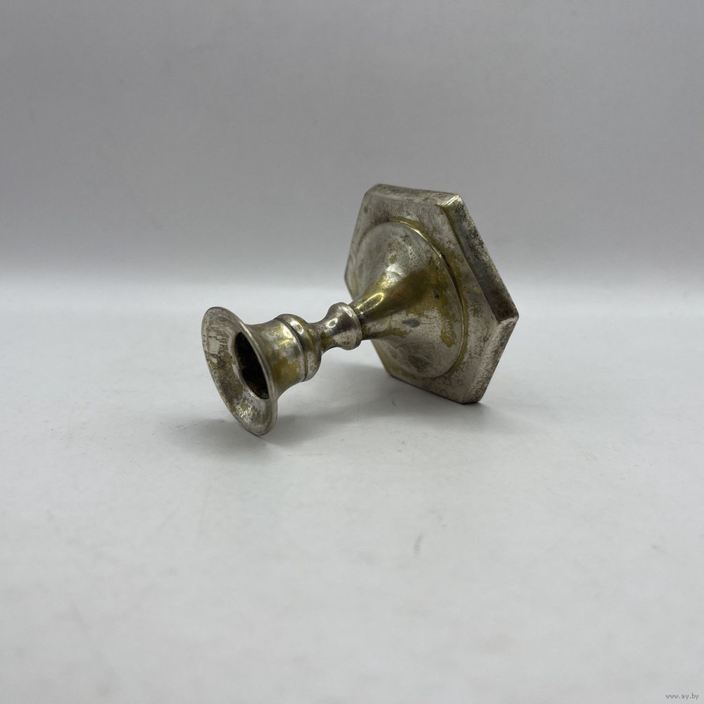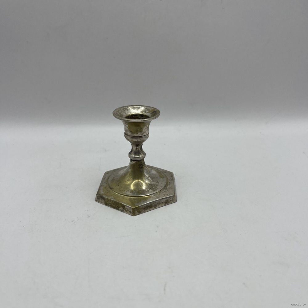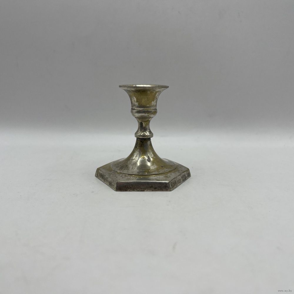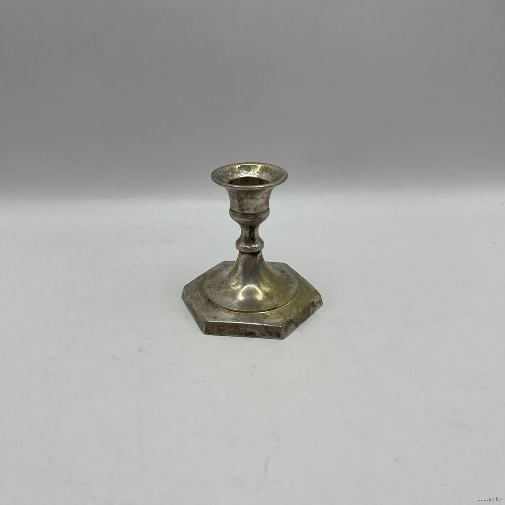Антикварный миниатюрный подсвечник из посеребренной латуни для пасхальной свечи. Германия. 1930-е г.г. Диаметр основания 5 см. Высота 5,5 см. Вес 51 г. Под свечу диаметром 1,5 см. Естественная патина, частичный сход серебрения.