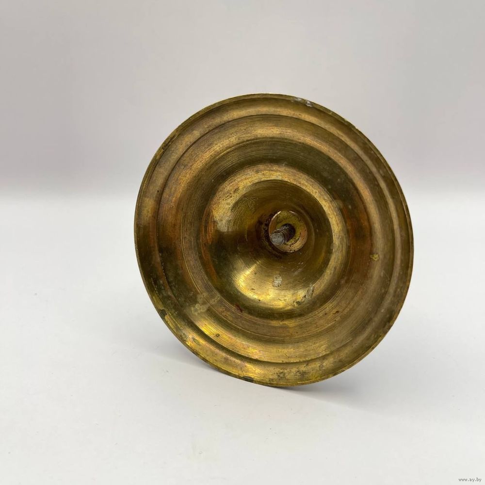 Подсвечник латунный в виде античной колонны на круглом основании. Италия. Разборный. Диаметр основания 10 см, высота 13 см. Естественная патина.