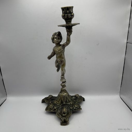 Антикварный подсвечник в стиле барокко из посеребренной латуни на рельефном фигурном основании, фигурка мальчика Путти с факелом в руке. Изящная розетка с рельефным узором. Италия. 1930-е г.г. Высота 28,5 см. Размер основания 14 х 14 см. Вес 1,15 кг Естественная патина, частичный сход серебрения.