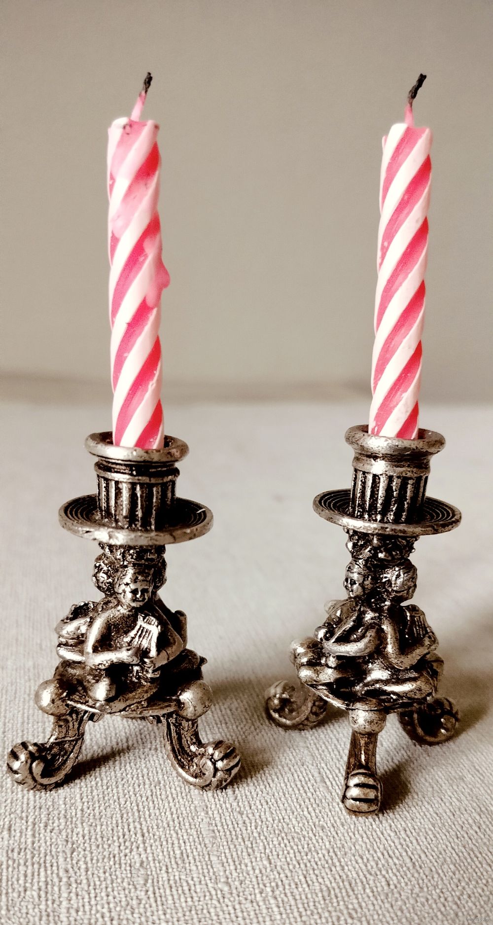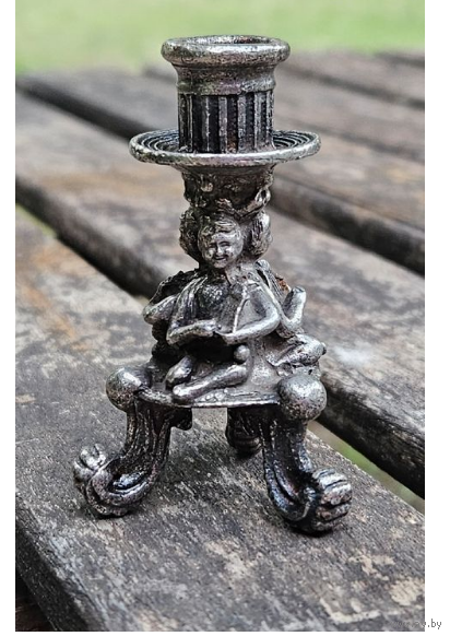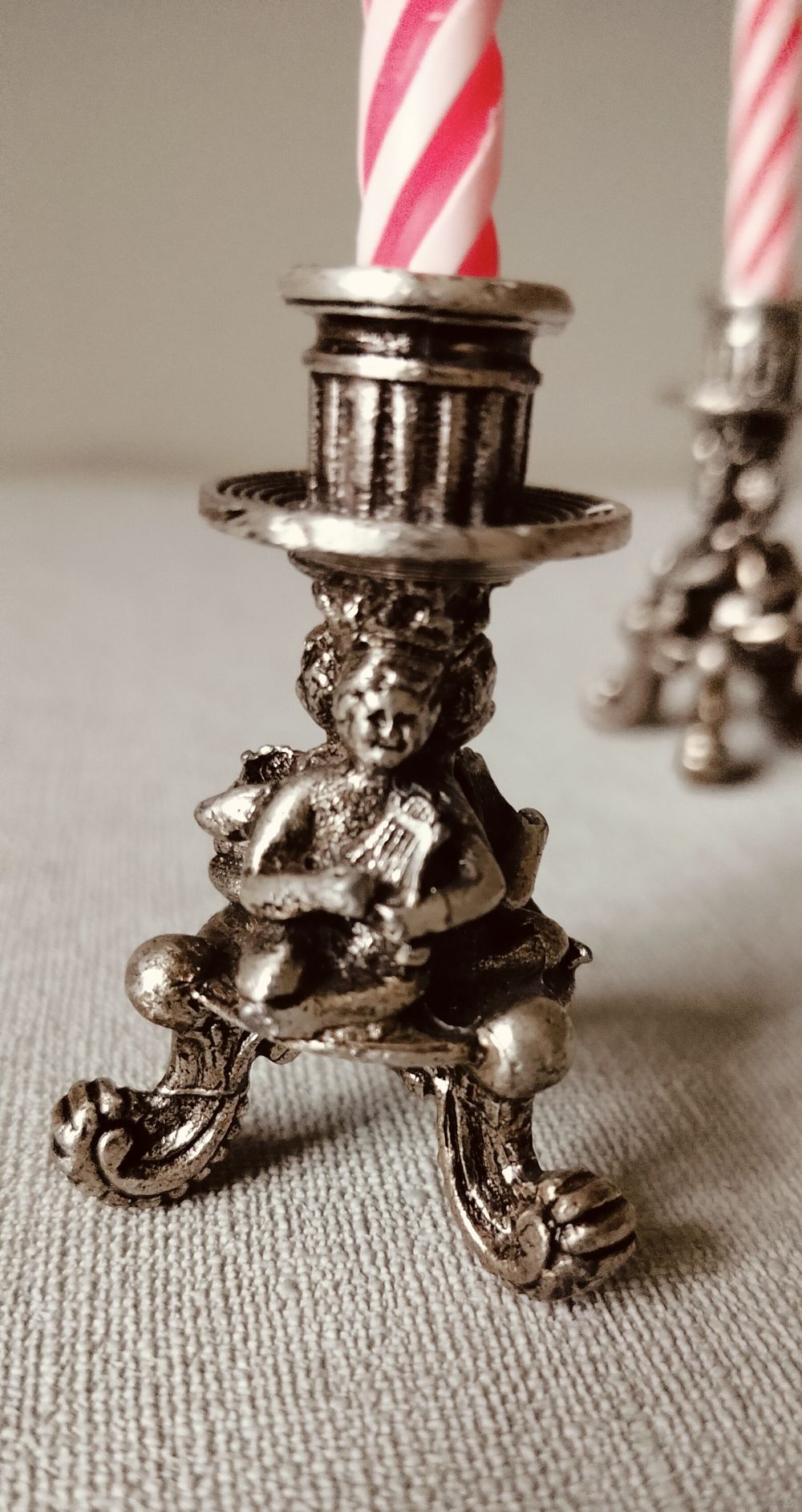 Два миниатюрных подсвечника из серебристого металла. Подсвечники на треноге, с изображением трех херувимов, играющих на лире. Франция, 1950-ые. Высота 6 см, диаметр основания 4 см. Для своего маленького размера подсвечники достаточно тяжелые (100 гр. каждый) и магнит не реагирует. Цена 120 руб за пару.