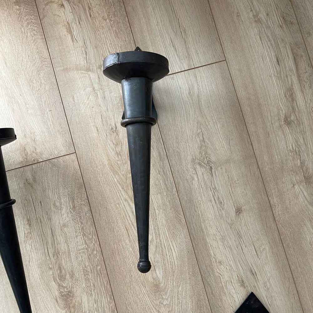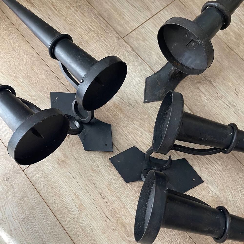 Массивные винтажные настенные подсвечники из черненого металла. Комплект из 3 штук. Австрия. Два двухрожковых и один однорожковый. Размер: двухрожковый 38 х 26 см, однорожковый 38 х 12, диаметр чаши под свечу 12 см. Следы времени, есть немного ржавчины.