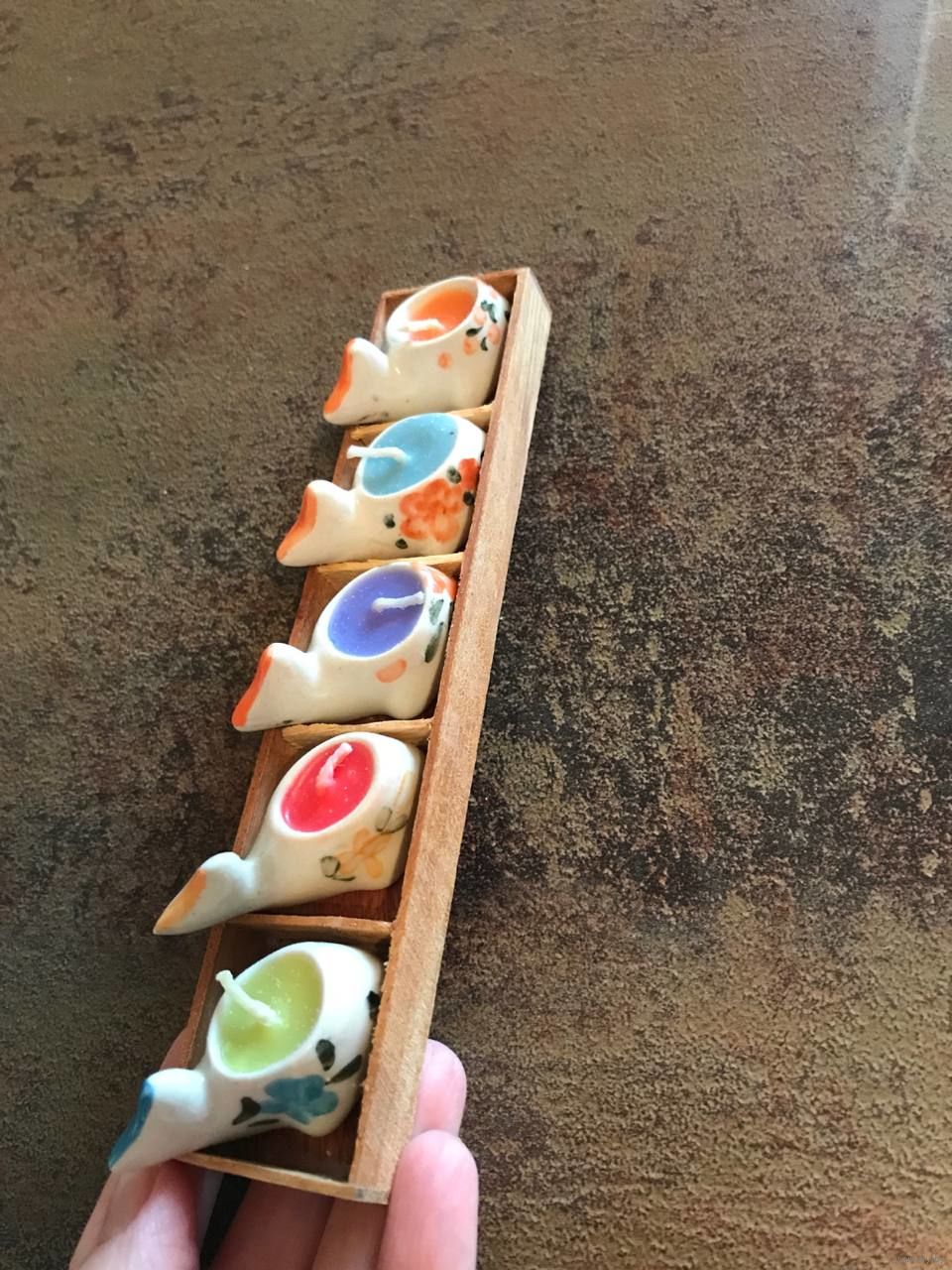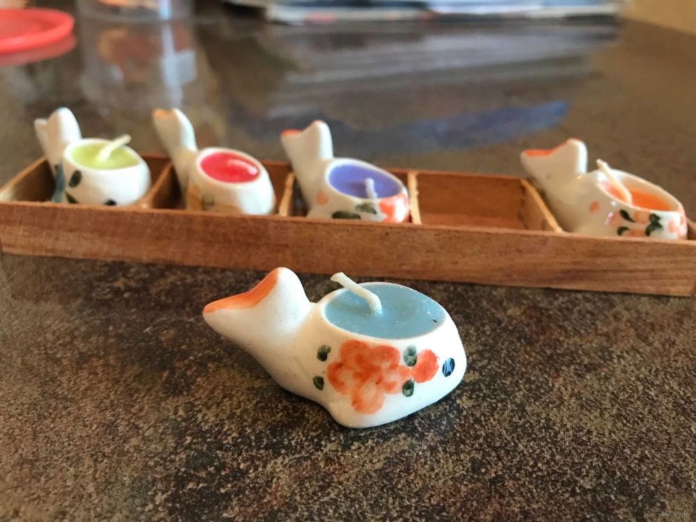 Подсвечники Свечки миниатюрные керамические расписные чайнички рыбки - как декор или настоящие свечи - в деревянной подставке размером