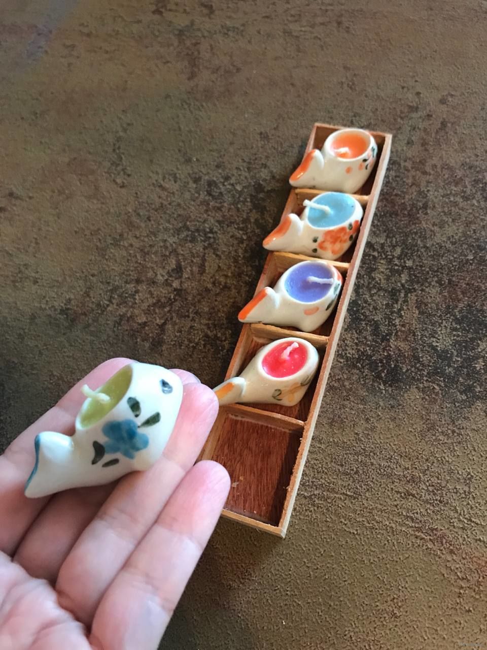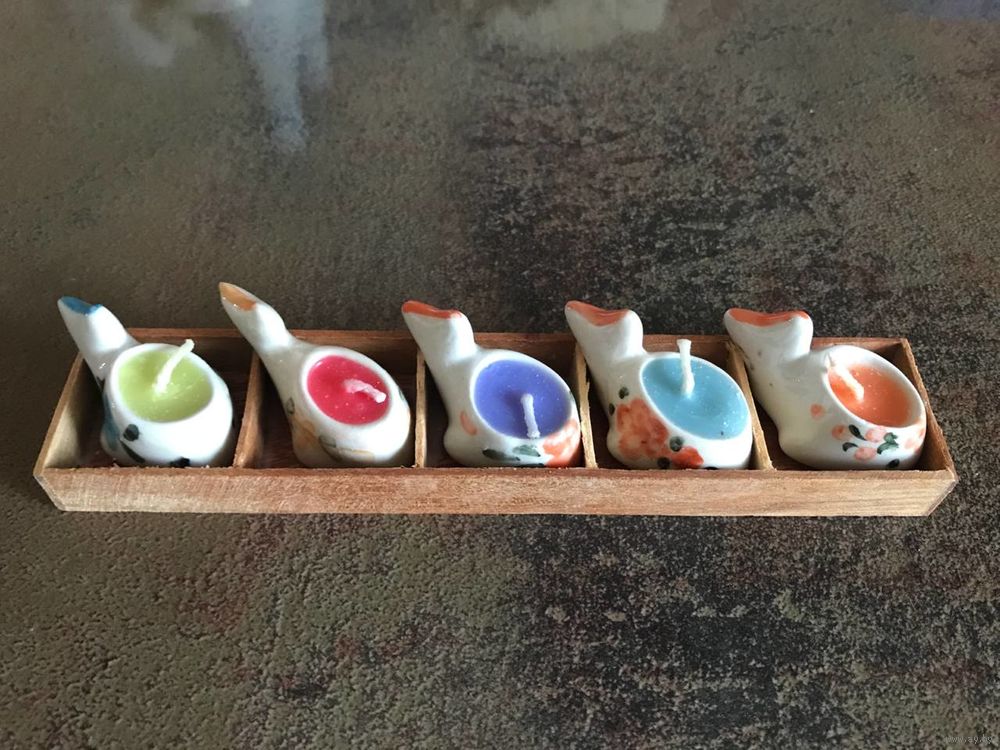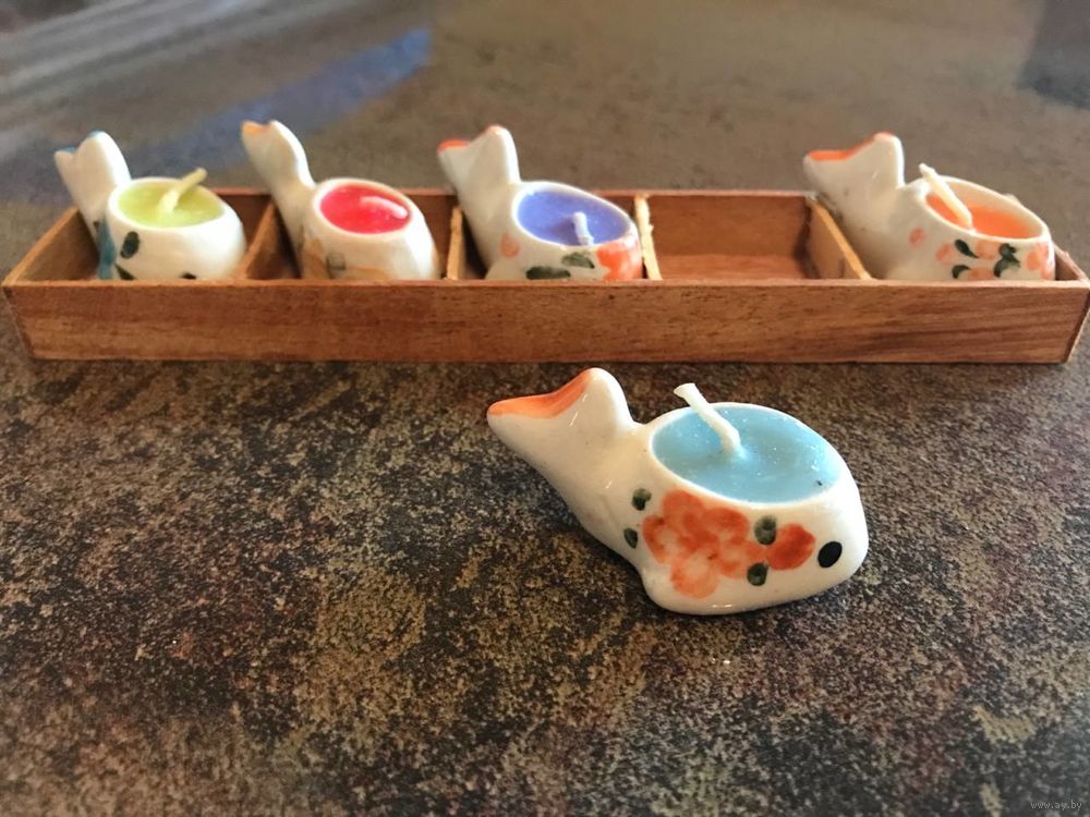 Подсвечники Свечки миниатюрные керамические расписные чайнички рыбки - как декор или настоящие свечи - в деревянной подставке размером