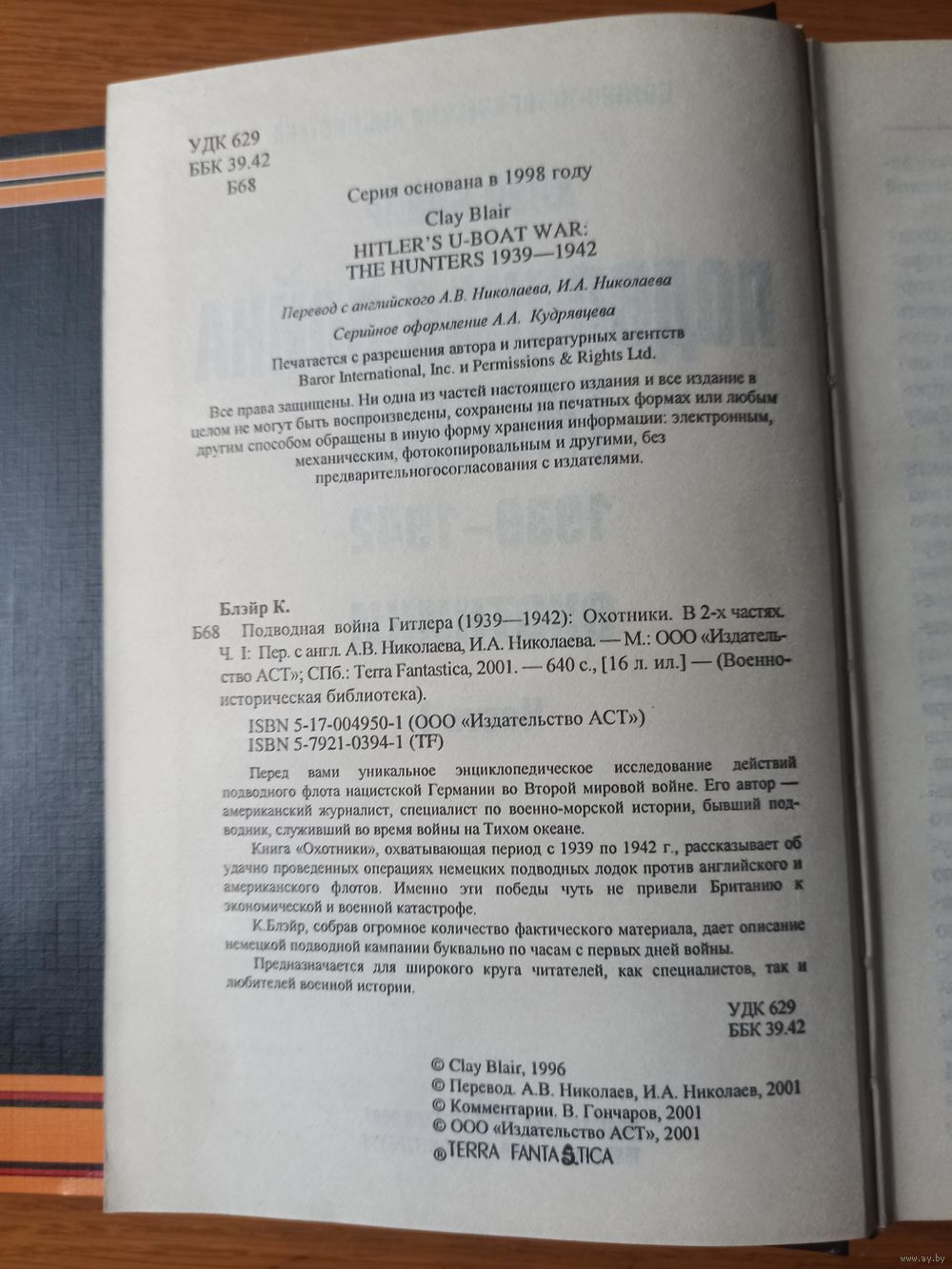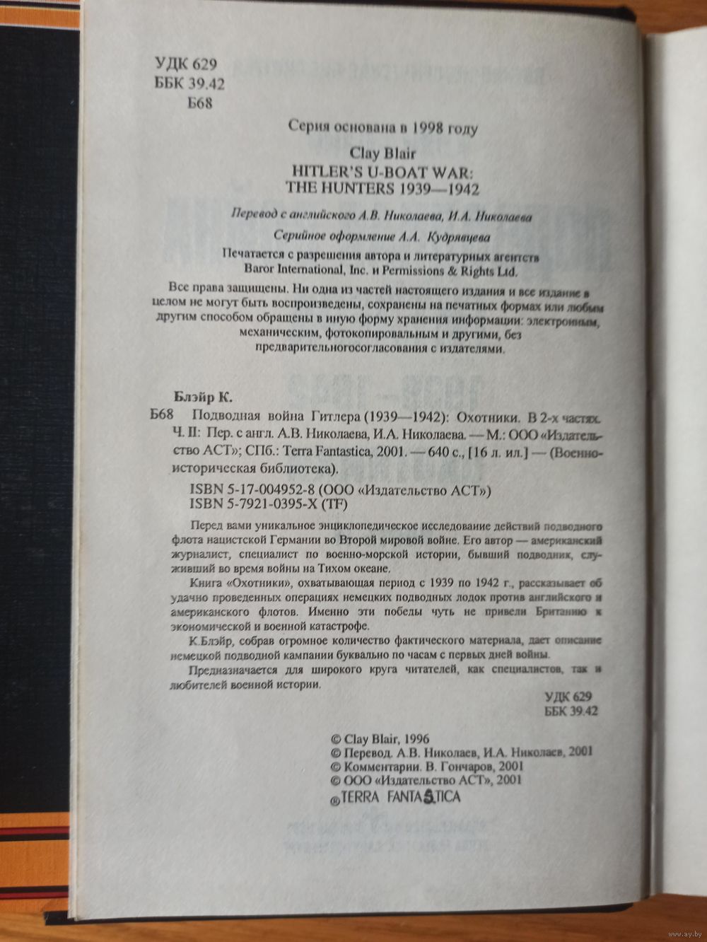 Перед вами уникальное энциклопедическое исследование действий подводного флота нацистской Германии во Второй мировой войне. Его автор - американский журналист, специалист по военно-морской истории, бывший подводник, служивший во время войны на Тихом океане. Книга "Охотники", охватывающая период с 1939 по 1942 г., рассказывает об удачно проведенных операциях немецких подводных лодок против английского и американского флотов. Именно эти победы чуть не привели Британию к экономической и военной катастрофе. К.Блэйр, собрав огромное количество фактического материала, дает описание немецкой подводной кампании буквально по часам с первых дней войны. Предназначается для широкого круга читателей, как специалистов, так и любителей военной истории.