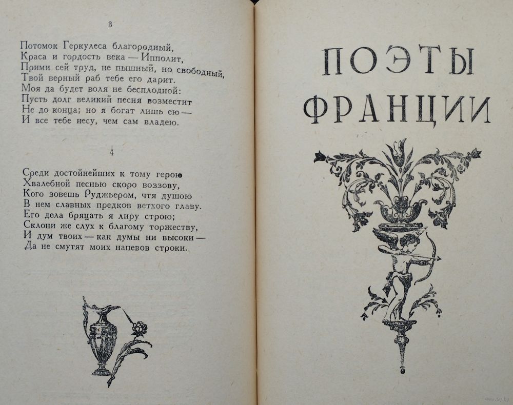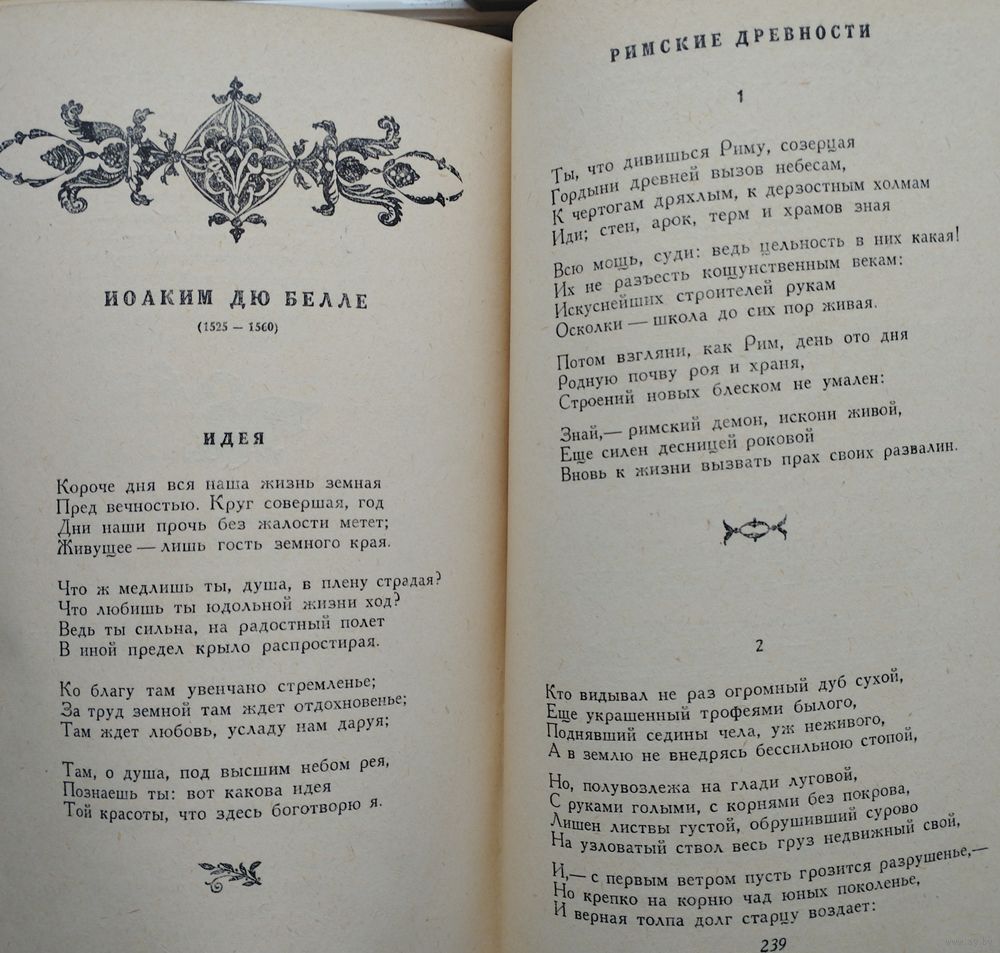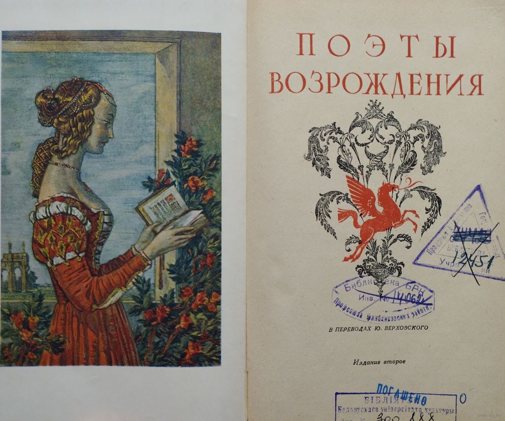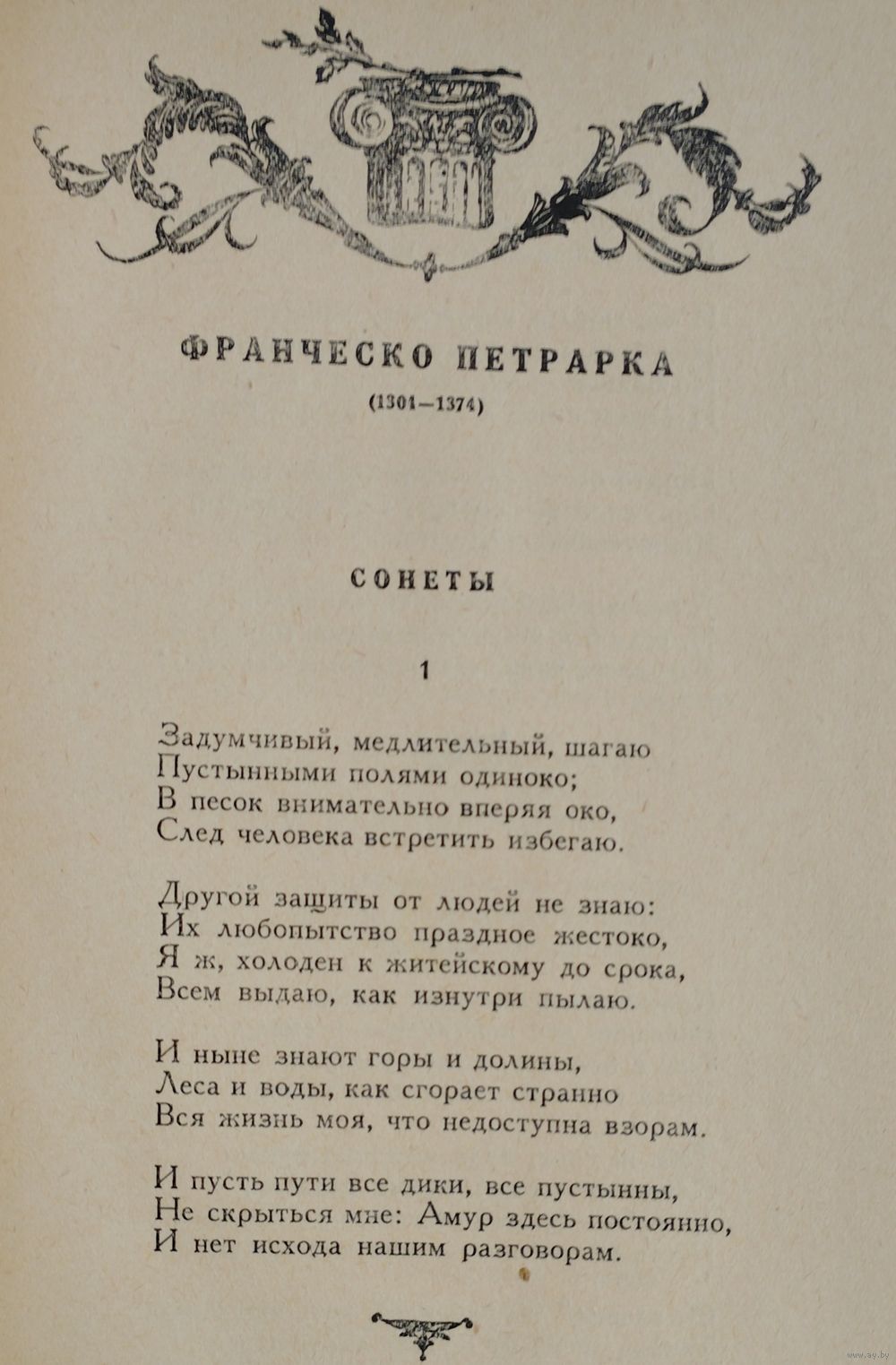 292 стр. Ляссе. В книгу вошли произведения самых выдающихся поэтов Италии (Франческо Петрарка, Джованни Боккаччо, Франко Саккетти, Доменикс Буркьелло и т.д.), Франции (Клеман Маро, Меллен де Сен-Желе, Морис Сэв и т.д.) и Испании (Гарсиласо де ла Вега, Луис де Леон и Мигель Сервантес). Есть штампы.