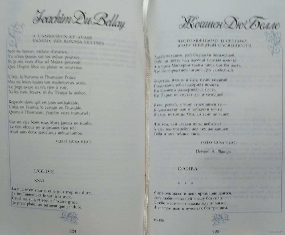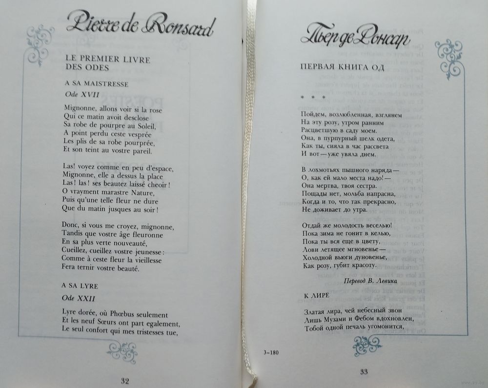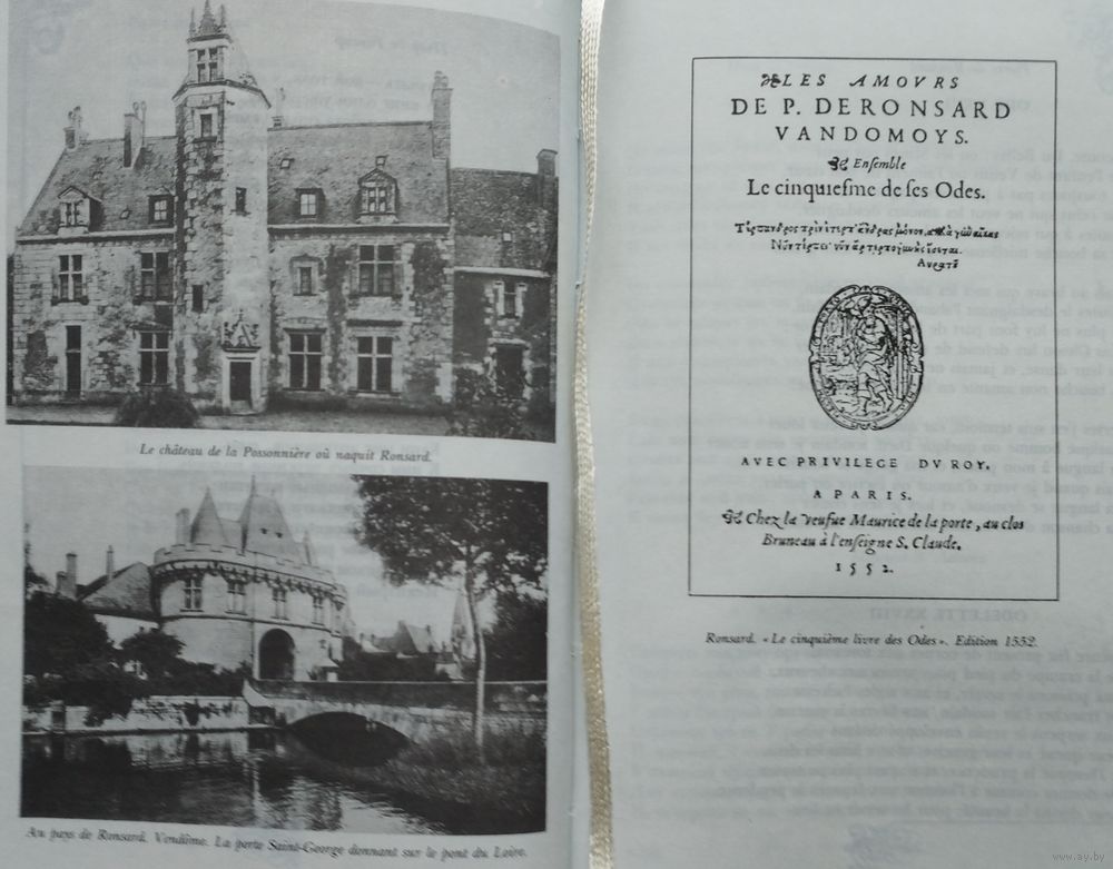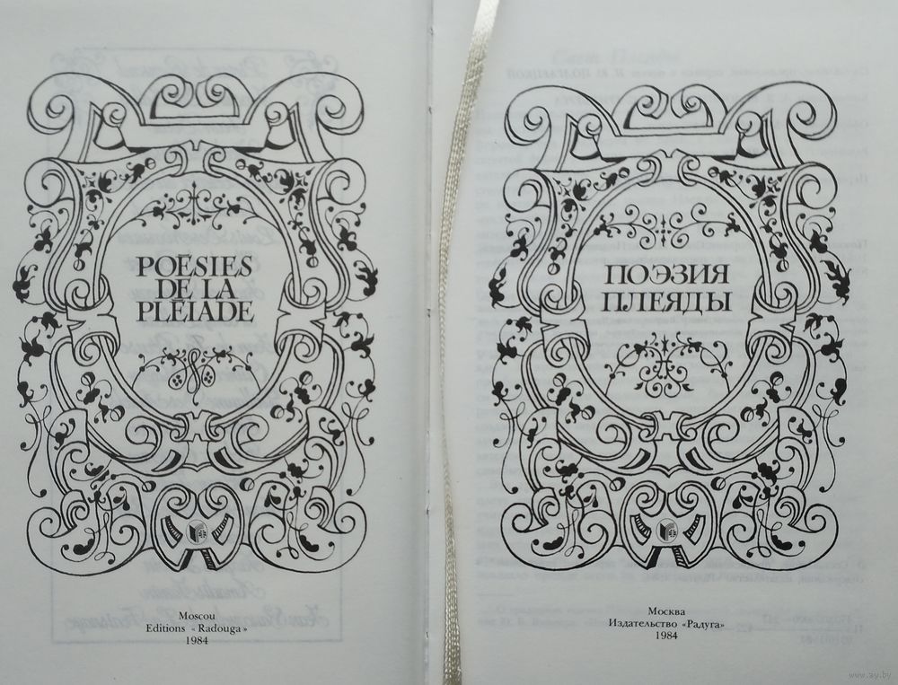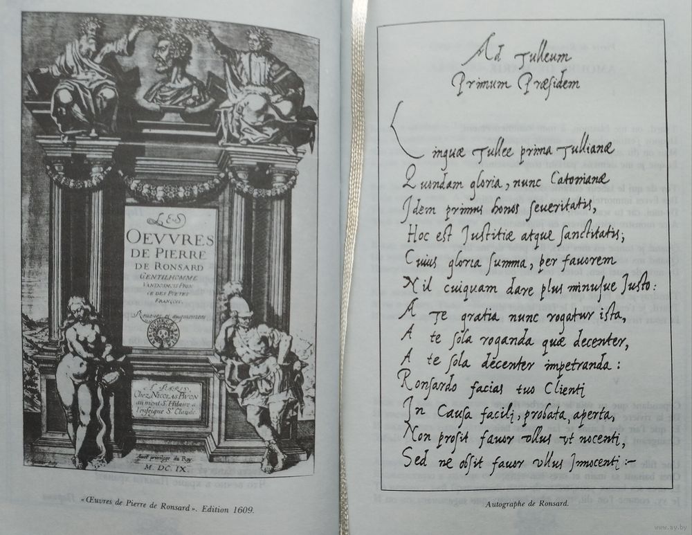 Ляссе. Тираж 10000 экз. 632 стр. На языке оригинала в настоящем сборнике представлены произведения П. Ронсара, Ж. дю Белле, П. де Тиара, Э. Жоделя, Ж. А.де Баифа и др. поэтов прославленной французской поэтической школы эпохи Возрождения. Читатель познакомится с их переводами на русский, выполненными крупнейшими мастерами переводческого искусства, а также молодыми советскими поэтами-переводчиками.