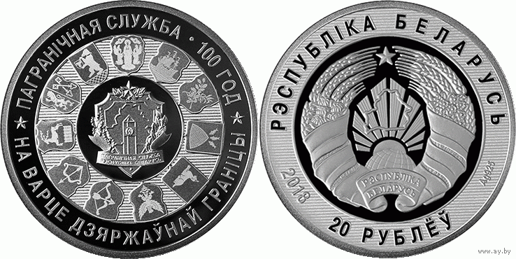 Пограничная служба Беларуси. 100 лет, 20 рублей 2018, серебро
