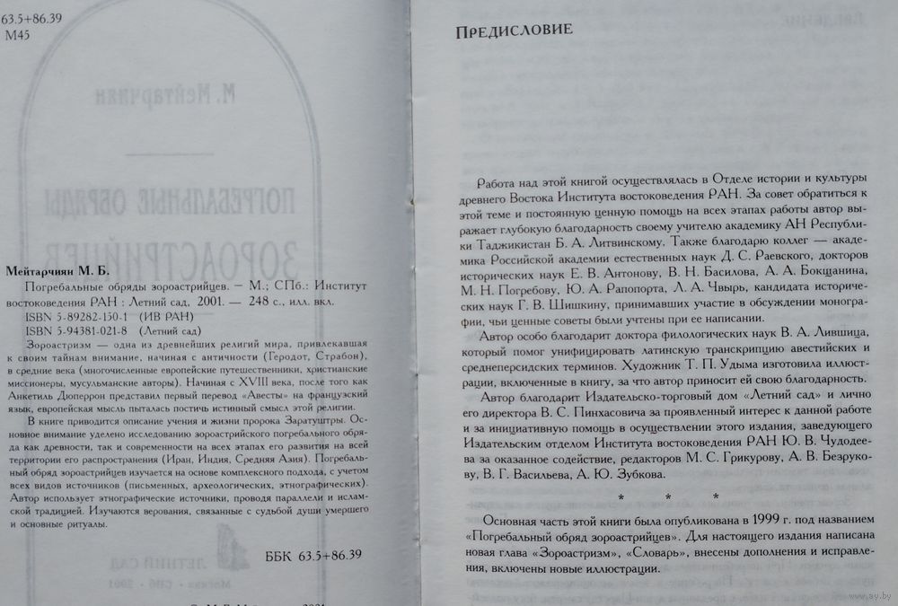 Большой формат. Тираж 1500 экз. 248 стр. Зороастризм - одна из древнейших религий мира, привлекавшая к своим тайнам внимание со времен античности (Геродот, Страбон). Начиная с XVIII века, после того как французский востоковед А. Анкетиль-Дюперрон представил первый перевод священной книги зороастрийцев "Авесты" на французский язык, европейская мысль пыталась постичь истинный смысл этой религии. Важнейшей основой зороастризма, как и всех мировых религий, является религиозно-мифологическое осмысление темы жизни и смерти, материализующееся в погребальных обрядах. Цель исследования Маргариты Мейтарчиян - проследить зороастрийский погребальный обряд во всей совокупности источников на всем протяжении его существования. Содержание: