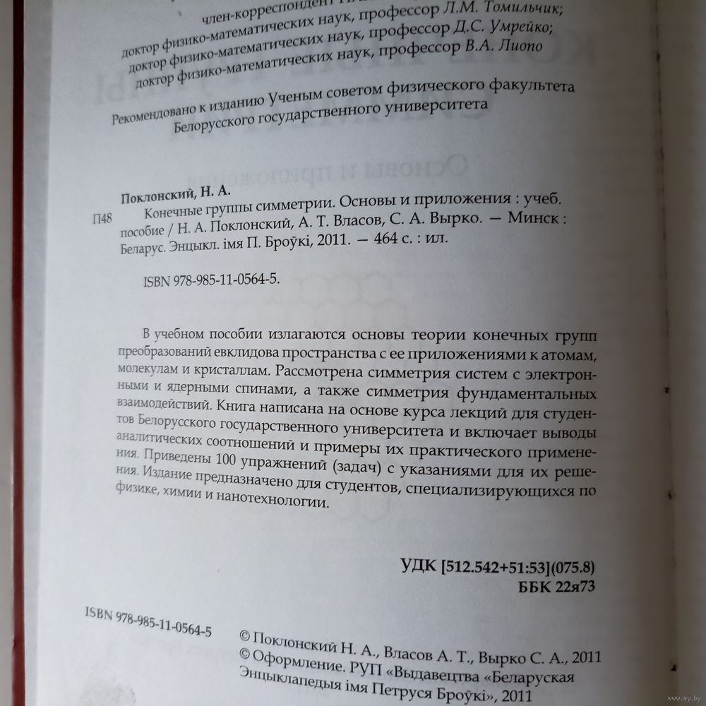 Поклонский Н. А. , Власов А. Т. , Вырко C. A. — Минск: Беларус. Энцыкл. iмя П. Броукi, 2011. — 464 с. — ISBN 978-985-11-0564-5.В учебном пособии излагаются основы теории конечных групп преобразований евклидова пространства с ее приложениями к атомам, молекулам и кристаллам. Рассмотрена симметрия систем с электронными и ядерными спинами, а также симметрия фундаментальных взаимодействий. Книга написана на основе курса лекций для студентов Белорусского государственного университета и включает вьводы аналитических соотношений и примеры их практического применения. Приведены 100 упражнений (задач) с указаниями для их решения. Издание предназначено для студентов, специализирующихся по физике, химии и нанотехнологии.