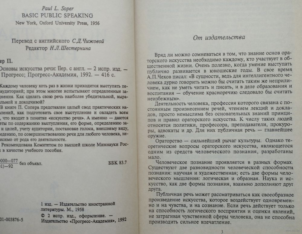 Перевод с англ. С. Д. Чижовой. Каждому человеку хоть раз в жизни приходится выступать перед аудиторией; при этом многие испытывают определенные затруднения. Как сделать свою речь наиболее убедительной, выразительной и доходчивой? В книге П. Сопера представлен целый свод практических наставлений, как подготовить свое выступление и овладеть всем тем, что входит в понятие «искусство речи». А именно —- даются советы по содержанию выступления, его форме, определению задач и целей, учету аудитории, постановке голоса, внешнему виду, поведению, по совершенствованию речи для любого человека, независимо от рода его деятельности. Содержание: