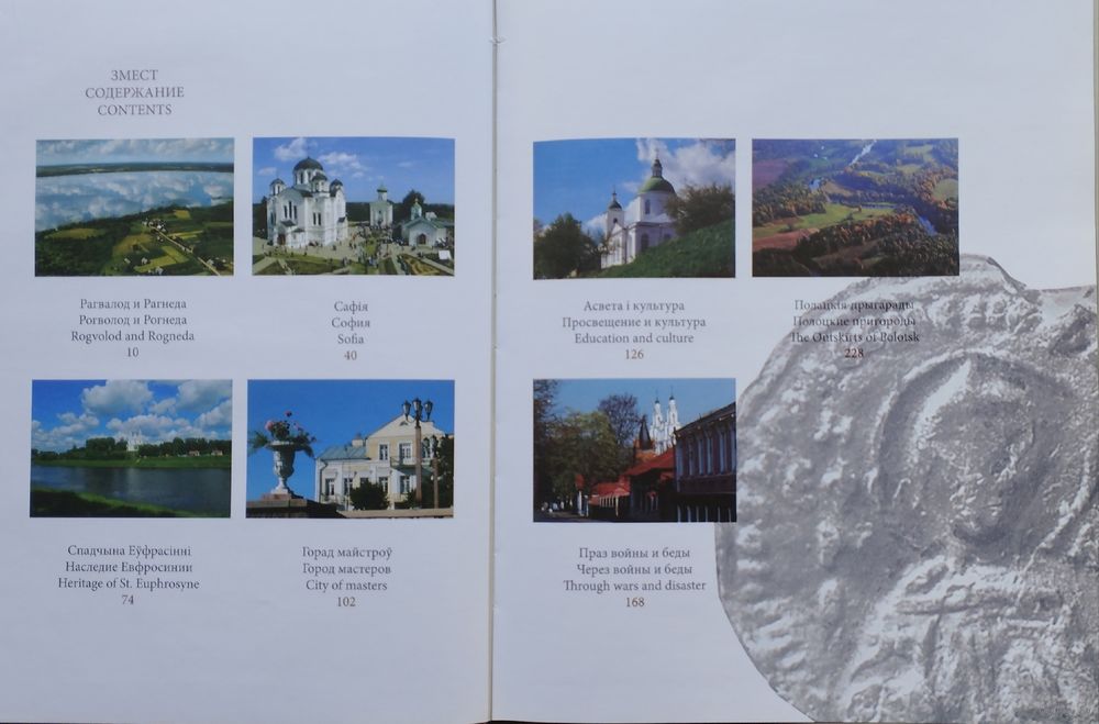 Падарункавае выданне на трох мовах. Вялікі энцыклапедычны фармат. Крэйдаваны альбом. Лясэ. Тыраж 1500 экз. 264 стар. Подарочное издание на трех языках. Большой энциклопедический формат. Мелованный альбом. Ляссе. Тираж 1500 экз. 264 стр. Для беларусаў Полацк — калыска дзяржаўнасці, духоўнасці, пісьменства, нацыянальнай свядомасці. Нездарма ж напісаў паэт: “Ад Еўфрасінні, ад Скарыны, ад Полацка пачаўся свет…” Наш, беларускі, свет сапраўды пачынаўся там, на берагах Палаты і Заходняй Дзвіны. У 2012 г. найстарэйшы горад Беларусі Полацк шырока святкаваў сваё 1150-годдзе. Між тым даказана, што гэта дата няправільная. У «Аповесці мінулых гадоў» Полацк упершыню згадваецца ў 862 годзе. Адпаведна, з гэтай даты і вядзецца афіцыйны адлік «працягласці жыцця» старажытнага Полацка. Аднак загадчык кафедры айчыннай і ўсеагульнай гісторыі Полацкага ўніверсітэта Дзяніс Дук навукова даказаў і абгрунтаваў, што Полацк існаваў задоўга да таго, як яго згадаў у «Аповесці …» невядомы аўтар. І нават абараніў па гэтай тэме доктарскую дысертацыю. Пасля яго сенсацыйнай працы, зробленай па выніках раскопак на полацкім гарадзішчы, археалагічна пацверджаным лічыцца іншы год заснавання Полацка – 780-ы. Гэта значыць на самой справе Полацк амаль на сто гадоў старэйшы, чым дэманстравалася на святочных плакатах да афіцыйных урачыстасцяў. І гэты факт прызнаны беларускай навукай.
