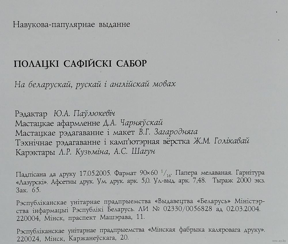 Полацкі Сафійскі сабор. Фота А.П.Дрыбаса, Дз.М.Раманюка, Э.Я.Цецярэўскага. Мінск : Беларусь, 2005 г. 57 с. Мяккая вокладка.