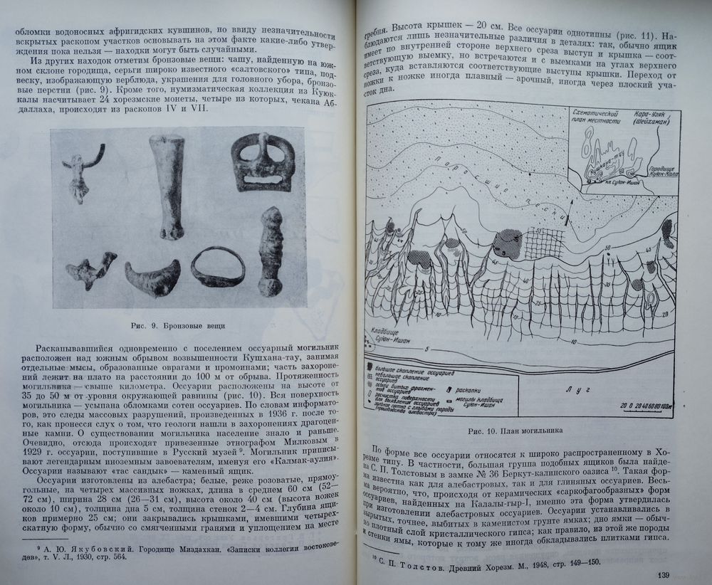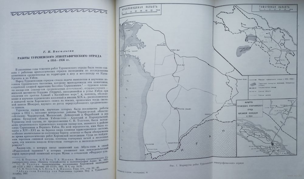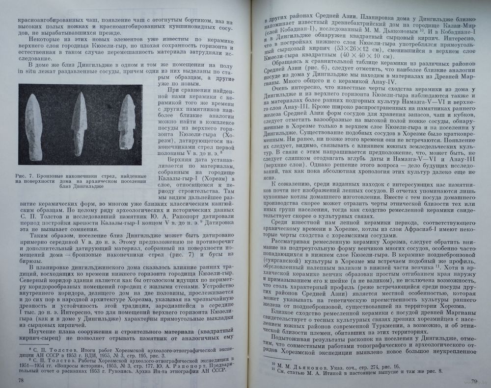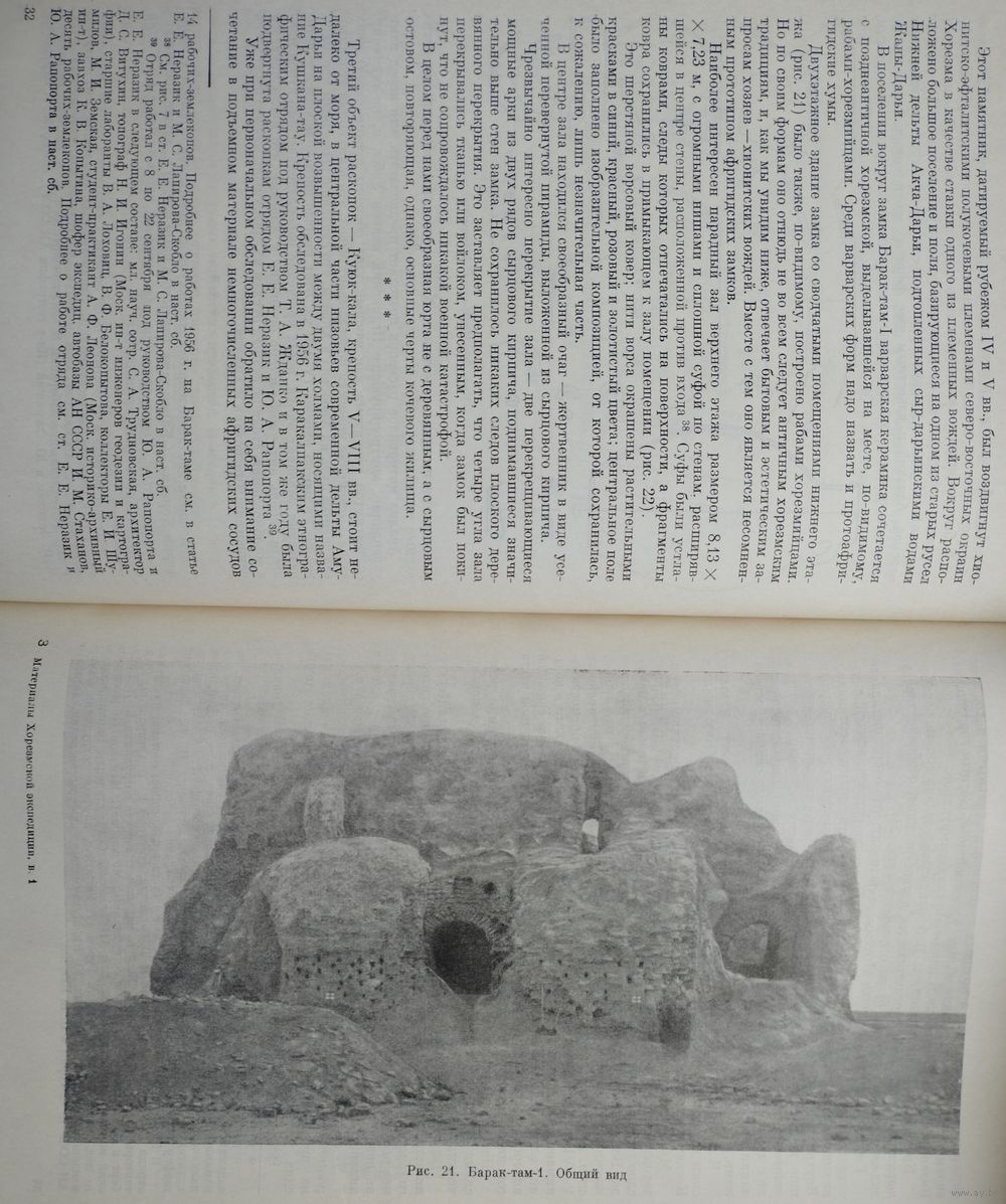 Полевые исследования Хорезмской археолого-этнографнческой экспе- Большой энциклопедический формат. Тираж 1200 экз. 212 стр. диции, проводившиеся на территории Хорезма и прилегающих областей, в 1958—1961 гг. охватила чрезвычайно широкий круг памятников. За че- тыре года были раскопаны илп детально обследованы десятки разновре- менных памятников, датируемых временем от III тысячелетия до н. э. до XVIII—XIX вв. Основной проблемой, над которой работала экспедиция, была проблема общественного строя п культурно-бытового уклада степных племен, окру- жавших древние центры античной и средневековой цивилизации Средней Азии, в Частности Хорезмский оазис. Эта работа была неразрывно связа- на с продолн-сенпем исследований по истории формирования и заселения человеком древних русел великих среднеазиатских рек — Аму-Дарьи и Сыр-Дарьи, нсторпп древней ирригации. Работы экспедиции, в которых на разных этапах участвовало до со- рока научных и научно-технических сотрудников и свыше 60 рабочих- землекопов, велись с апреля до середины октября ежегодно. Археологиче- ские исследования экспедиции проводились, как и в предшествующие го- ды, в основном в трех районах: в правобережном Хорезме, на территории Турткульского района Кара-Калпакской АССР; на землях древнего оро-