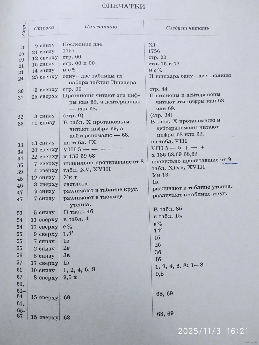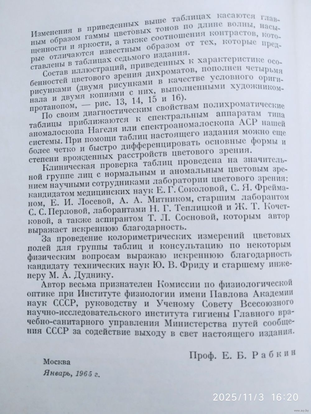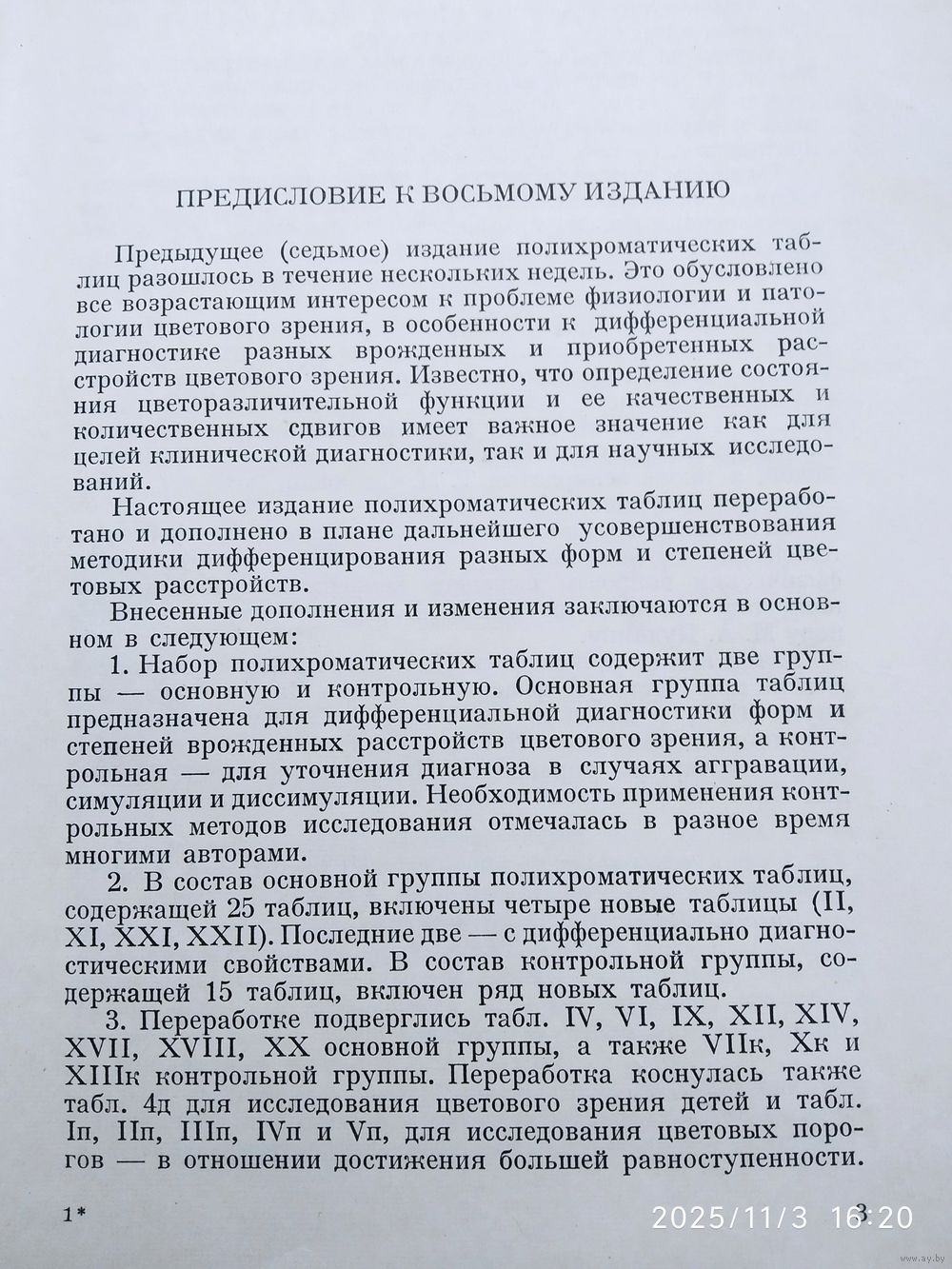 Содержание - 1. Общие основы полихроматической методики. 2. Классификация расстройств цветового зрения. 3. Распространенность расстройств цветового зрения. 4. теоретические основы метода. 5. Полихроматические таблицы. 6. дифюдиагностика цв.расстройств. 7. Собственно методика. В Приложении Полихроматические таблицы, распределенные по группам - две группы - основную - в составе 25 таблиц, и контрольную - в составе 15 таблиц. Первая предназначена для дифференциальной диагностики форм и степеней врожденных расстройств цветового зрения в исследовательской и клинической практике и для ограничения их от приобретенных, а вторая - контрольная - для уточнения диагноза в наблюдаемых иногда случаях аггравации, симуляции и диссимуляции. Есть специальные таблицы для исследования цветового зрения детей. Схемы масок для правильного использования таблиц. Также издание содержит серию условных цветных оригиналов картин и их копий, выполненных художниками с врожденными расстройствами цветового зрения.