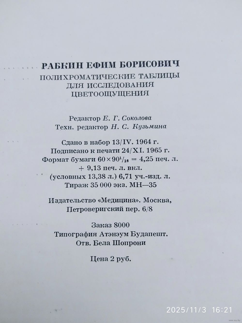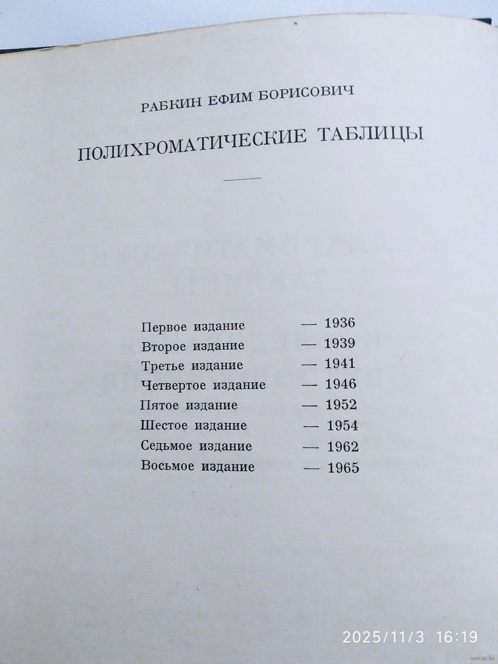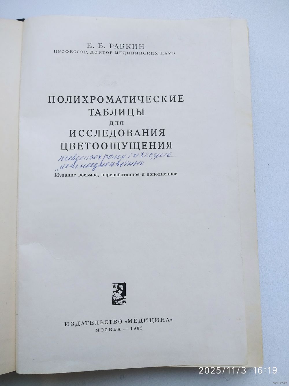 Содержание - 1. Общие основы полихроматической методики. 2. Классификация расстройств цветового зрения. 3. Распространенность расстройств цветового зрения. 4. теоретические основы метода. 5. Полихроматические таблицы. 6. дифюдиагностика цв.расстройств. 7. Собственно методика. В Приложении Полихроматические таблицы, распределенные по группам - две группы - основную - в составе 25 таблиц, и контрольную - в составе 15 таблиц. Первая предназначена для дифференциальной диагностики форм и степеней врожденных расстройств цветового зрения в исследовательской и клинической практике и для ограничения их от приобретенных, а вторая - контрольная - для уточнения диагноза в наблюдаемых иногда случаях аггравации, симуляции и диссимуляции. Есть специальные таблицы для исследования цветового зрения детей. Схемы масок для правильного использования таблиц. Также издание содержит серию условных цветных оригиналов картин и их копий, выполненных художниками с врожденными расстройствами цветового зрения.