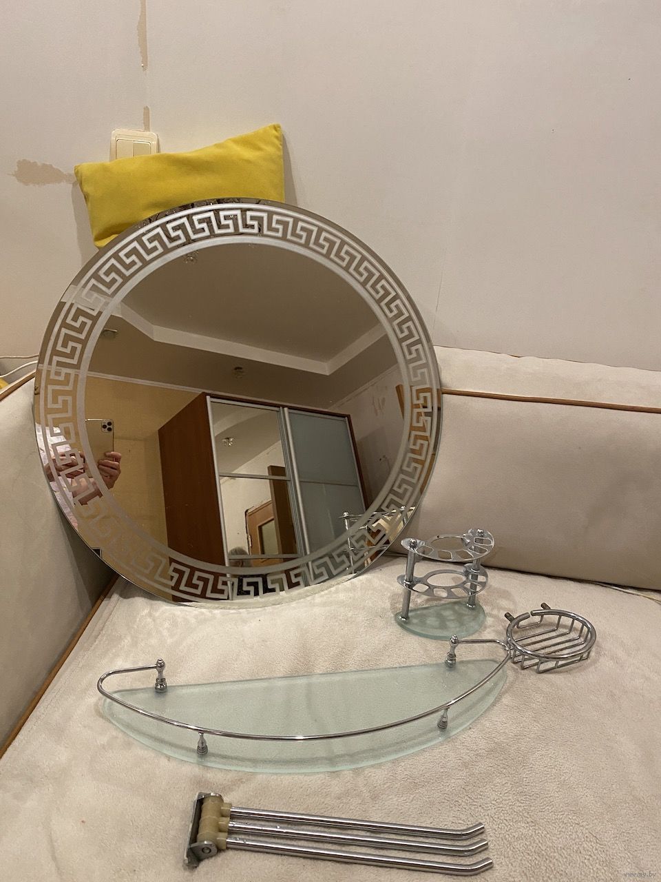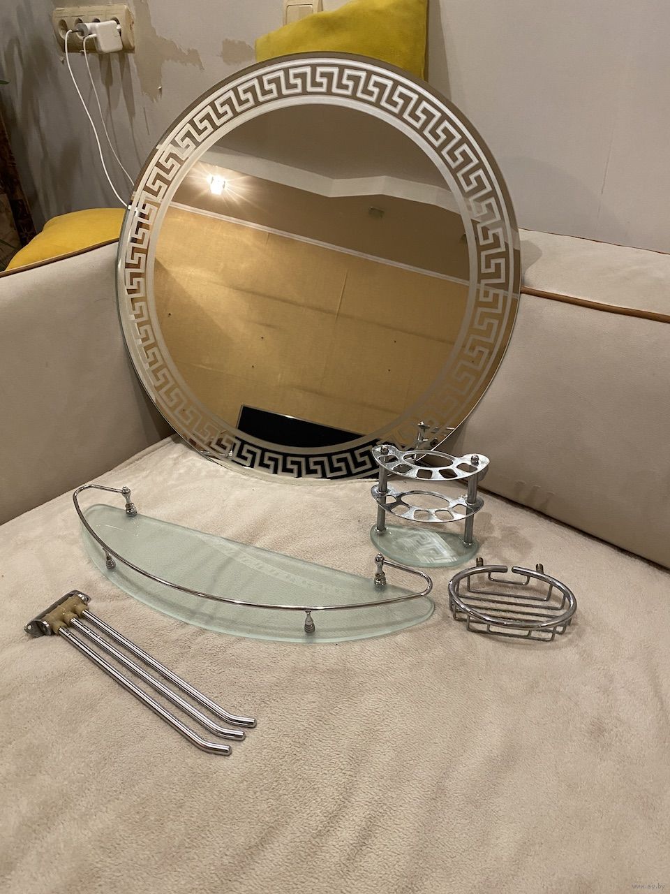 Полочки, сушилка и зеркало для ванной комнаты. Зеркало 37 руб., сушилка для полотенец нержавейка, 10 руб., полка под зеркало 15 руб., полка угловая трехсекционная 25 руб., полка для мыла нержавейка 10 руб., полка для зубных щеток 10 руб. Всё в хорошем состоянии, из качественной, тяжелой нержавейки