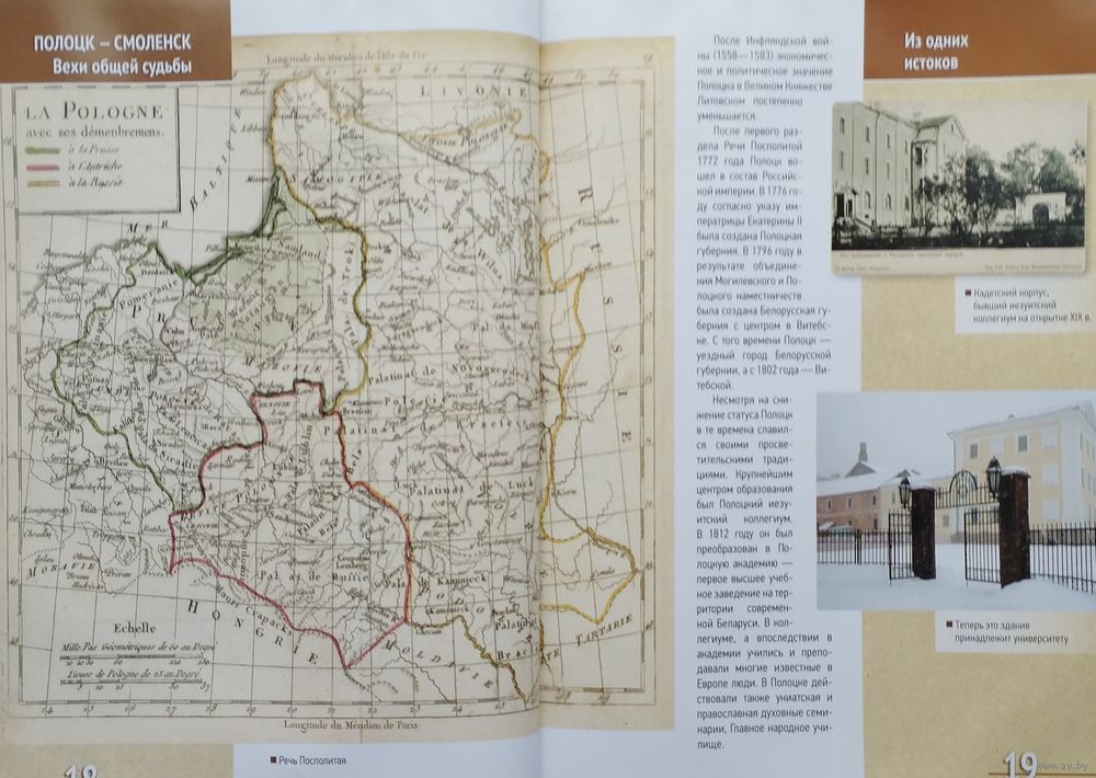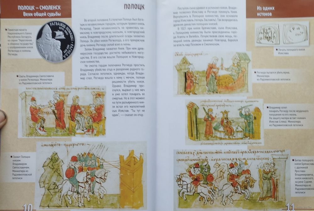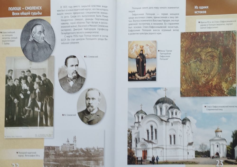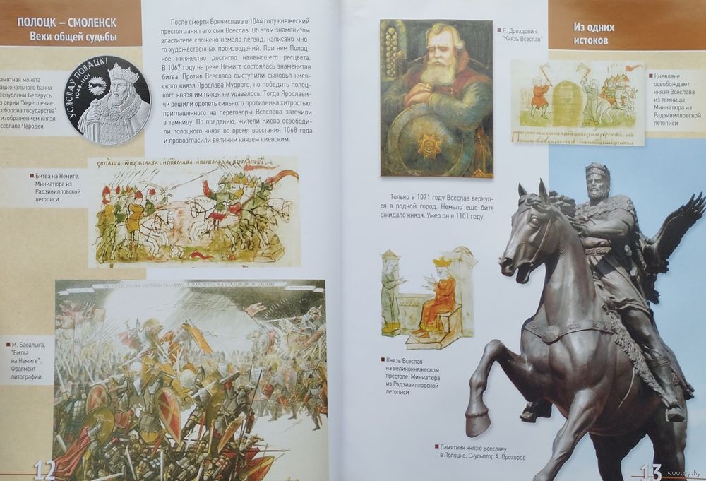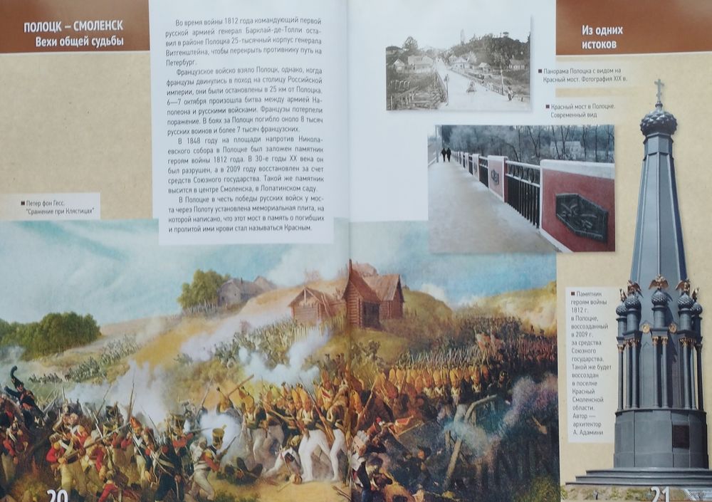 Большой энциклопедический формат. Мелованный альбом. Тираж 3200 экз. 160 стр. Издание посвящено 1150-летию городов Полоцка и Смоленска и представляет своеобразный путеводитель по древним славянским городам Полоцку и Смоленску с акцентом на историческую связь этих городов. Прекрасные иллюстрации позволяют проследить пути развития Полоцка и Смоленска от первого упоминания в летописи до наших дней, ознакомиться с наиболее значительными памятниками старины, архитектурой, музейными коллекциями. Книга предназначена для широкого круга читателей. Она послужит хорошей поддержкой учителям и воспитателям при организации экскурсий школьников в города Полоцк и Смоленск, при изучения братских культурных и духовных традиций, при построении эффективных схем сотрудничества Беларуси и России в различных сферах деятельности в рамках Союзного государства.