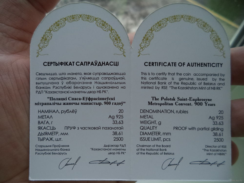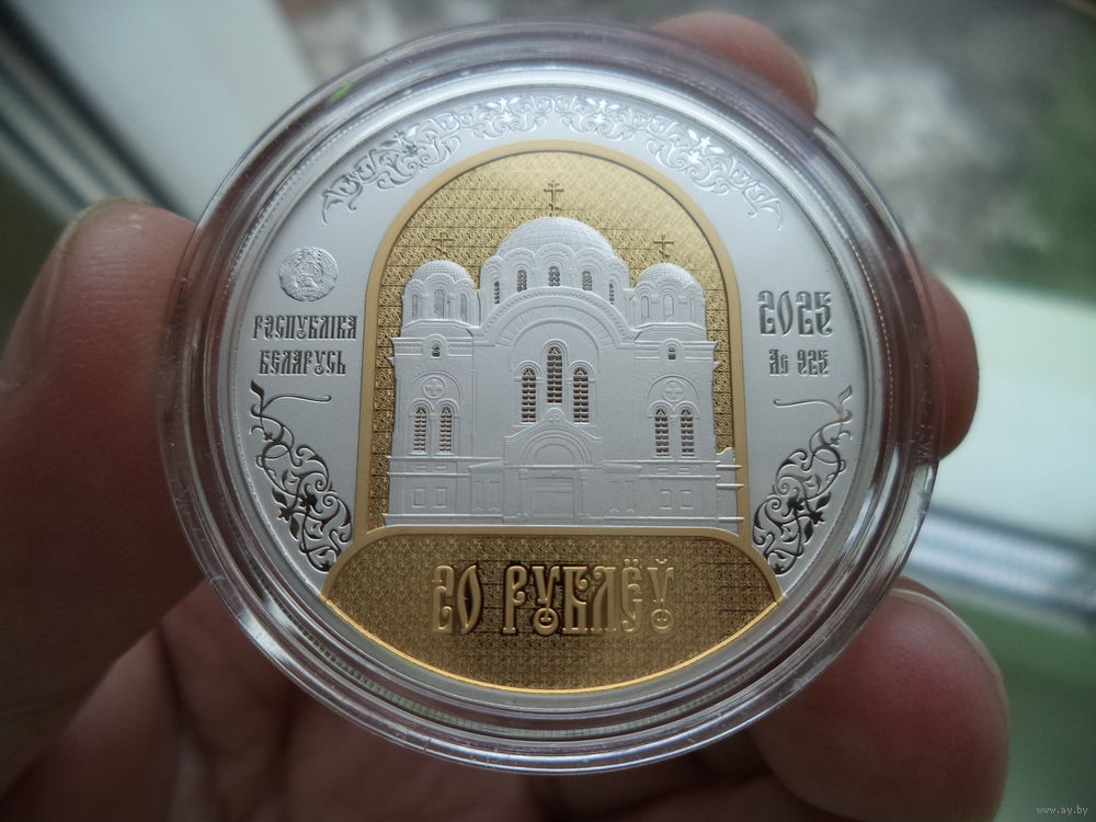 по кругу вверху – орнамент; слева посередине – надпись: РЭСПУБЛІКА БЕЛАРУСЬ и рельефное изображение Государственного герба Республики Беларусь; в центре – Спасо-Евфросиниевский монастырь; внизу – номинал 100 и 20 РУБЛЁЎ (на серебряных) и 1 РУБЕЛЬ (на медно-никелевой); справа посередине – проба сплава (на серебряных) и год чеканки.