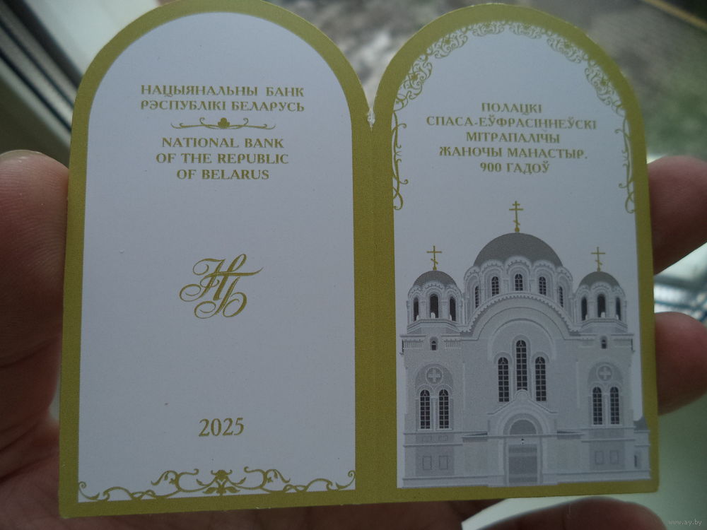 слева стилизованное изображение креста и надпись ”ПОЛАЦКІ СПАСА-ЕЎФРАСІННЕЎСКІ МІТРАПАЛІЧЫ“, справа стилизованное изображение креста и надпись ”ЖАНОЧЫ МАНАСТЫР 900 ГАДОЎ“; в центре – стилизованное изображение ангелов, коронующих Евфросинию Полоцкую на фоне женского монастыря, и год его создания ”1125“; внизу – орнамент по кругу.