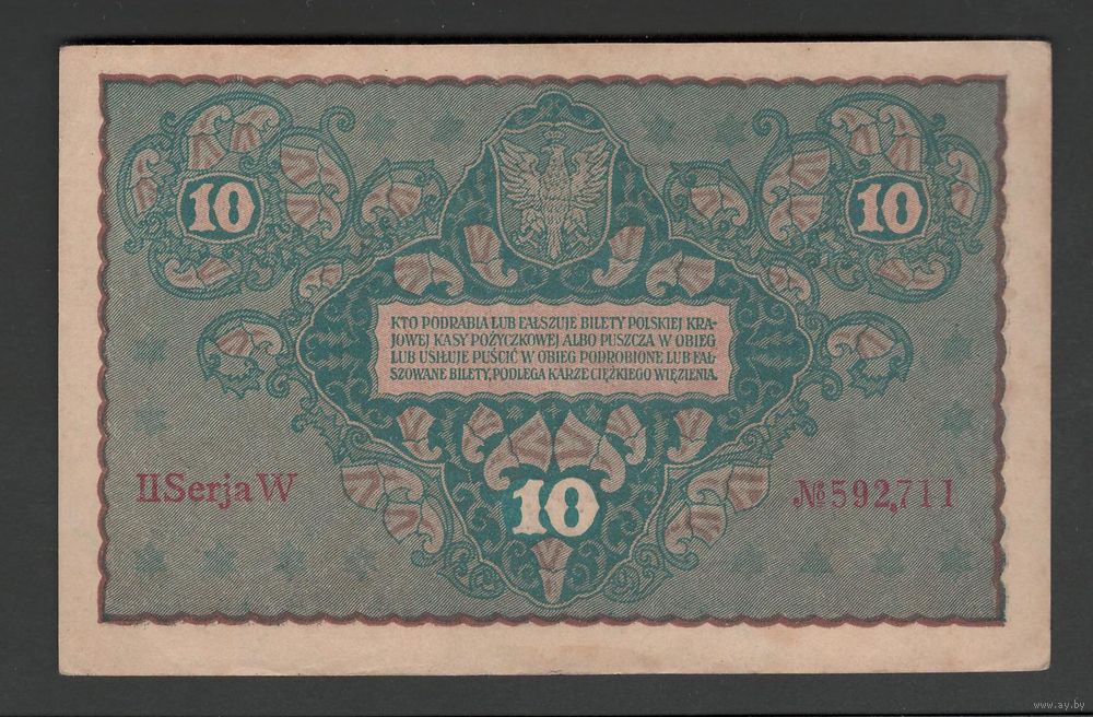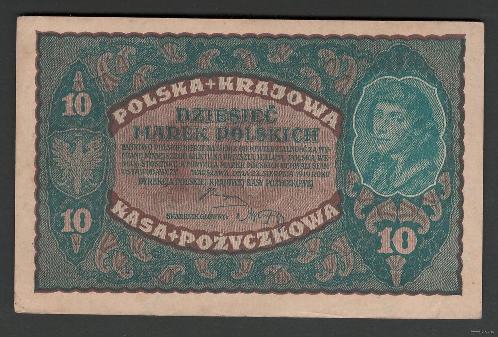 Польша 10 марок 1919 года. С запятой в номере. Тип P-25(1). Состояние aUNC