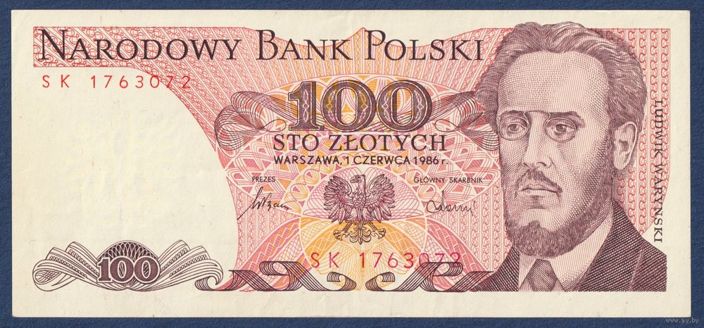 Польша, 100 злотых 1986 г, P-143e (SK, революционер Людвиг-Фаддей Северинович Варынский), XF