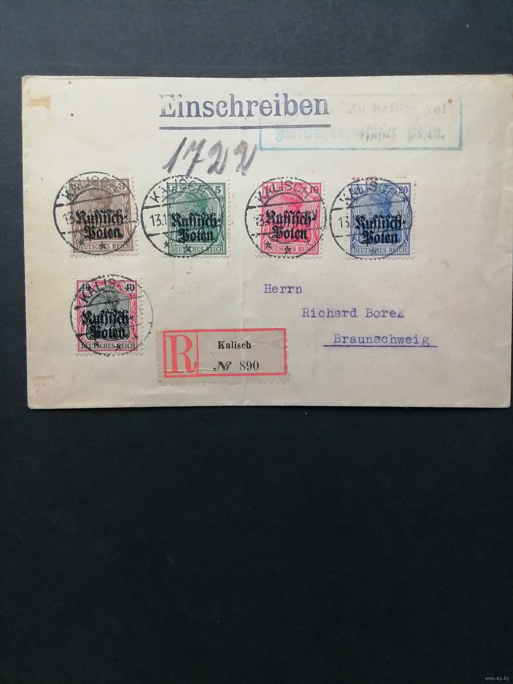 Польша 1915 Конверт с полной серией марок "DEUTSCHEN REICHES" Mi.84-87,90 периода немецкой оккупации Польши с надпечаткой "Deutschen post in Polen" (гашение KALISCH) Mi.1-5